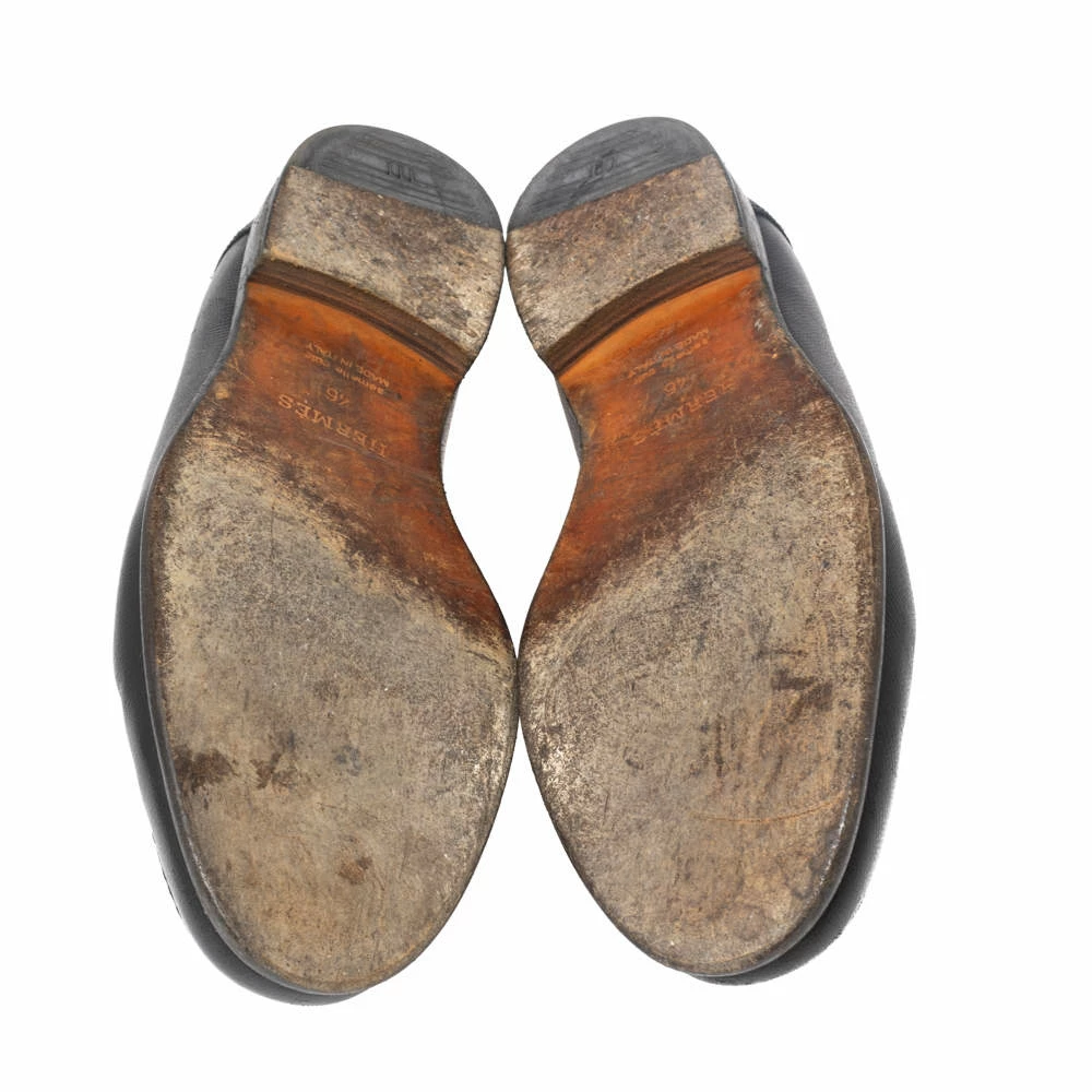These loafers from Hermes beautifully celebrate the blend of excellent shoe craftsmanship and style. Crafted from leather and styled into a smart shape, this pair of black loafers embody luxury and comfort. Made in Italy, they feature comfy leather insoles, neatly stitched detailing, and a keeper strap on the front. You can pair them up with your formals for a smart look.