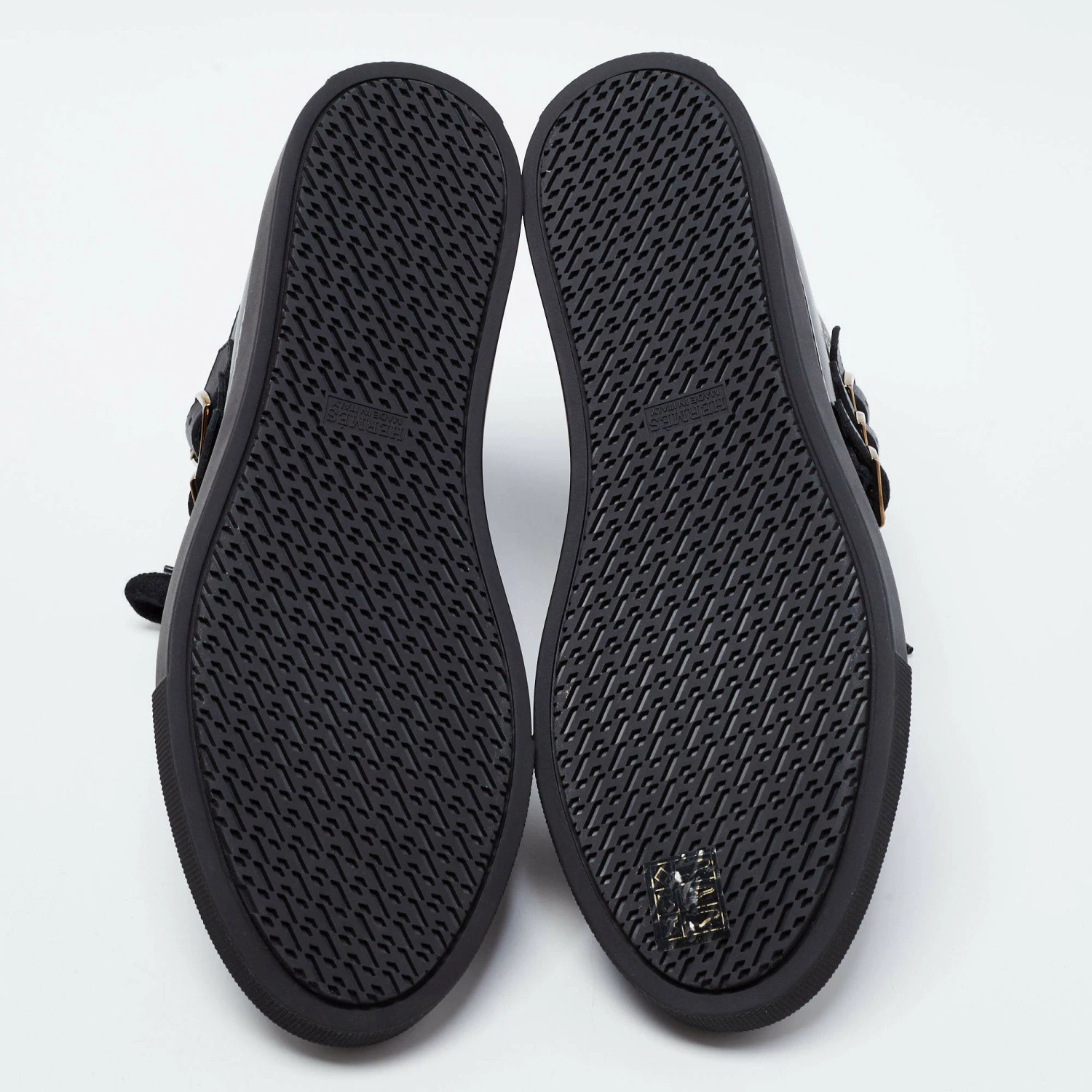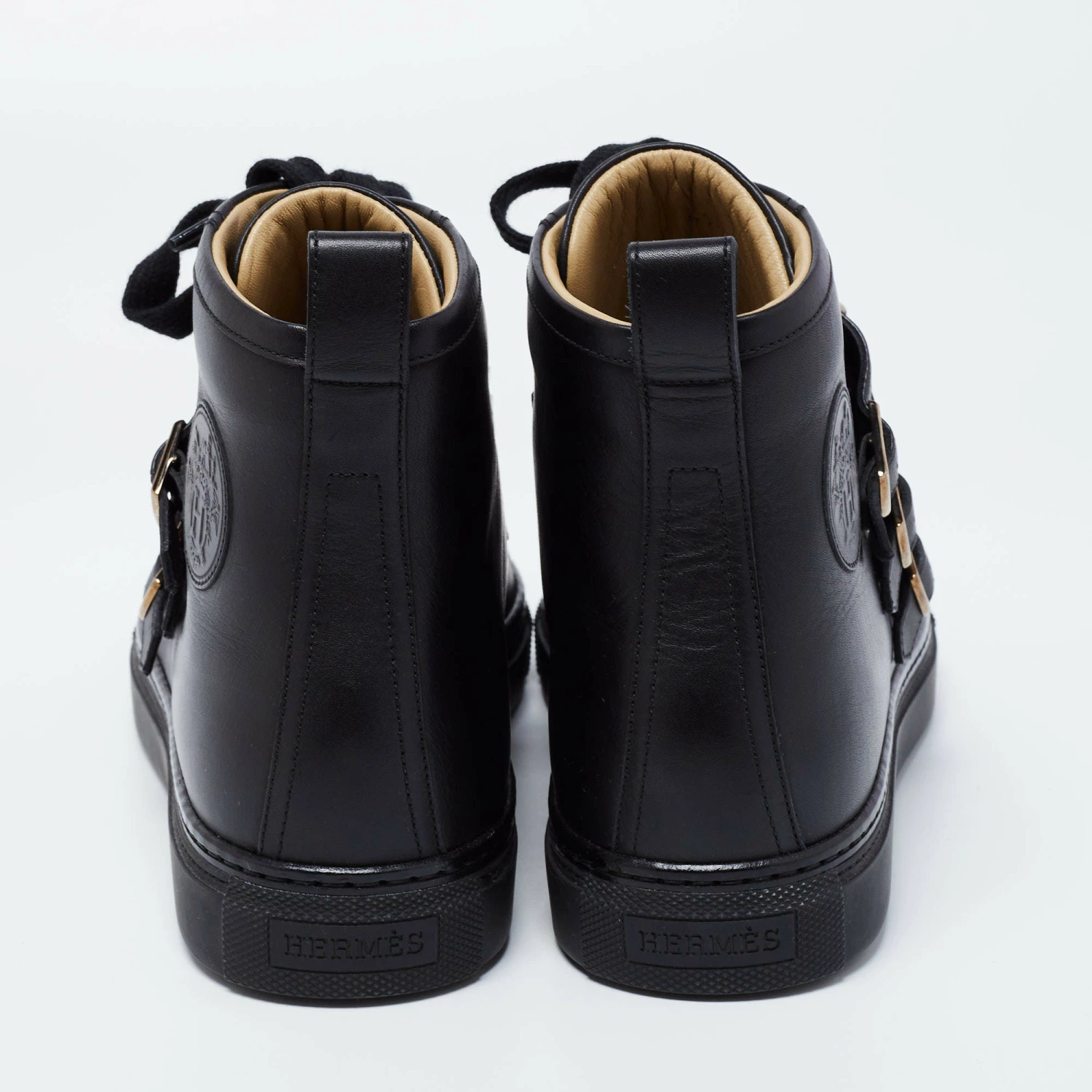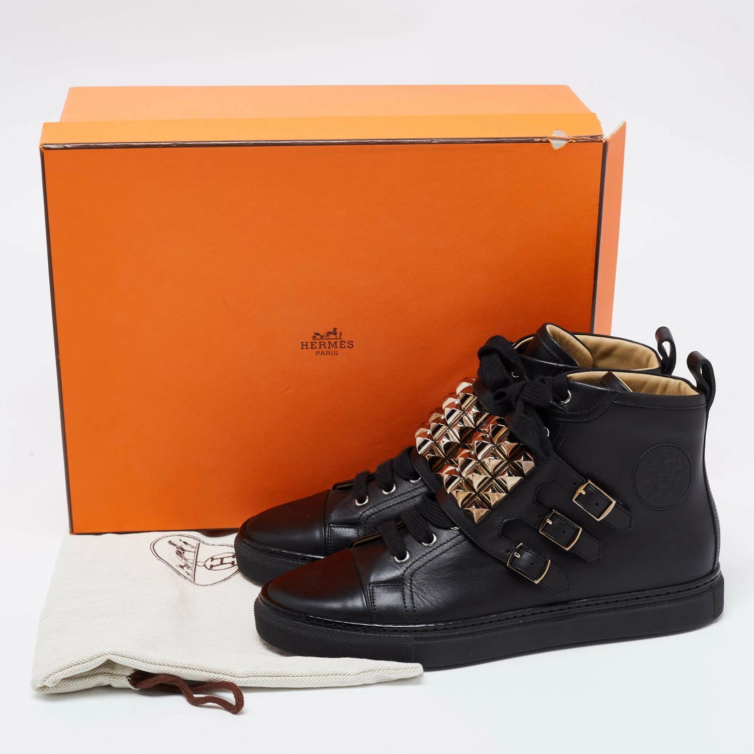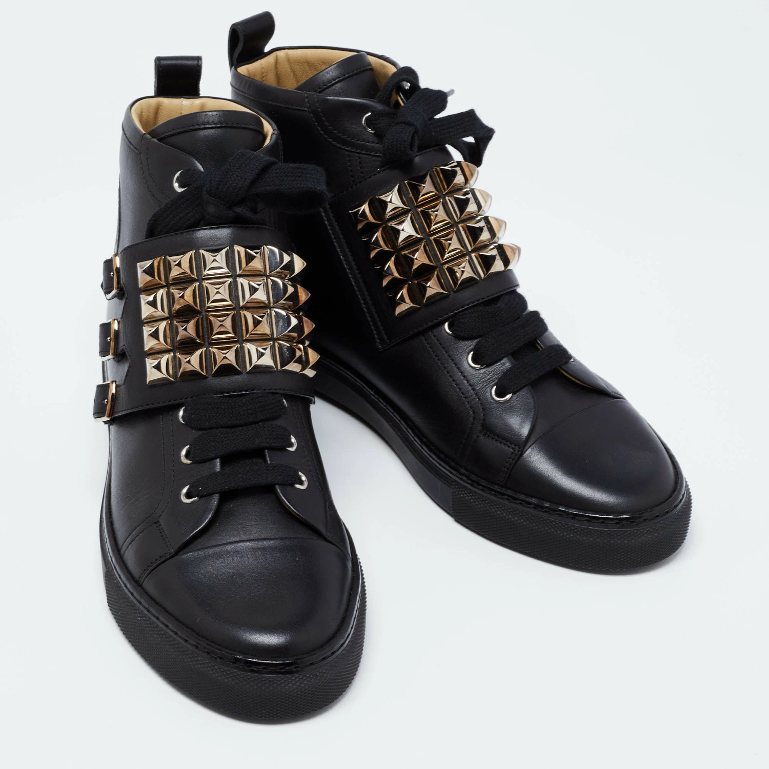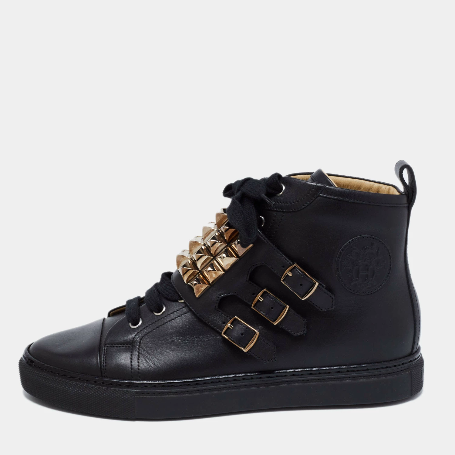 Pull off a super-stylish look with ease in this pair of black high-top sneakers from the house of Hermes. Crafted from leather, the Lennox shoes truly embody luxury and comfort with their unique studded design. They feature lace-ups, gold-tone buckles, leather insoles, and tough soles. A statement pair worthy of being flaunted!