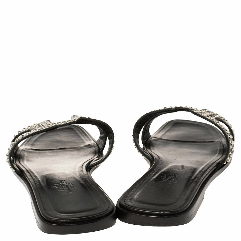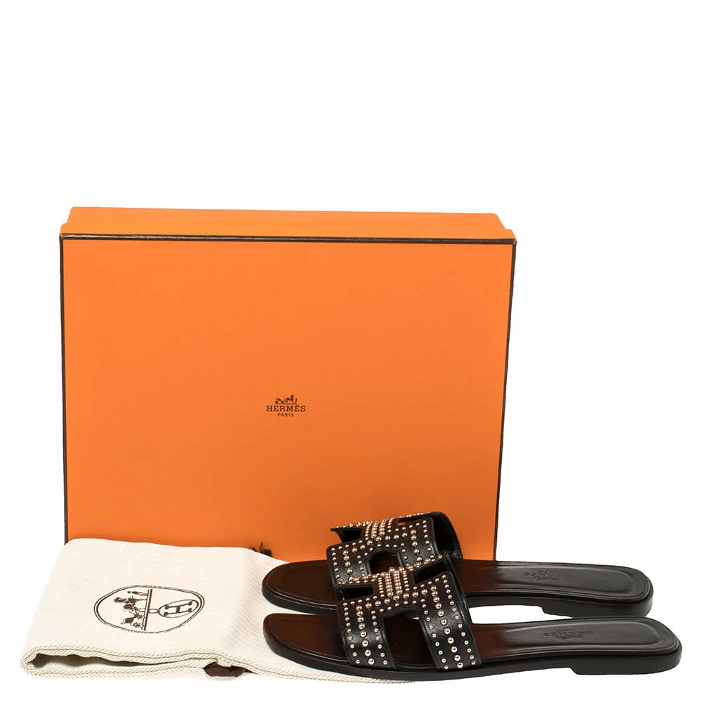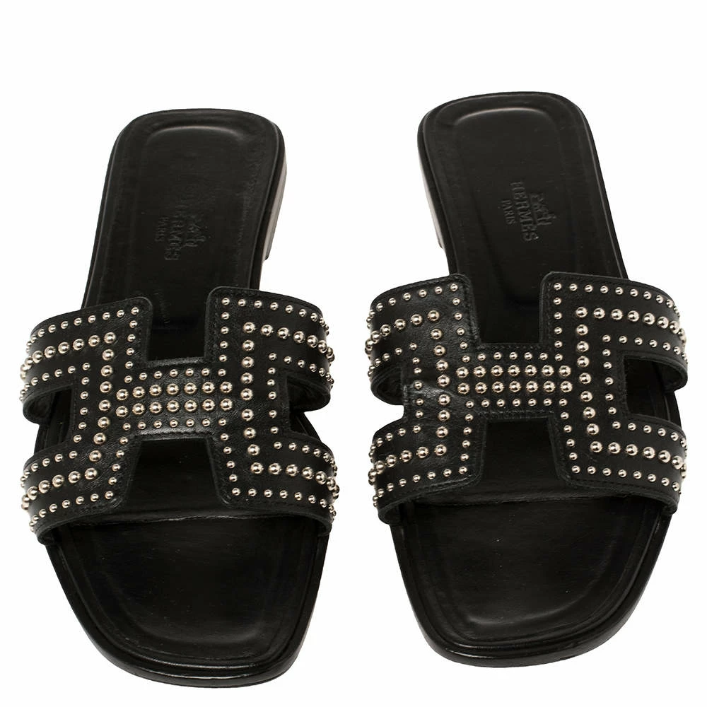 Put your best foot forward this season in these pretty Hermes flats. These black studded Oran flats have been crafted from leather in Italy and they feature the iconic H on the vamps as well as insoles meant to provide comfort at every step. These flats are sure to attract admirers!