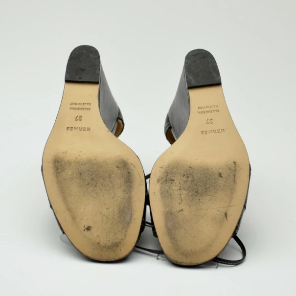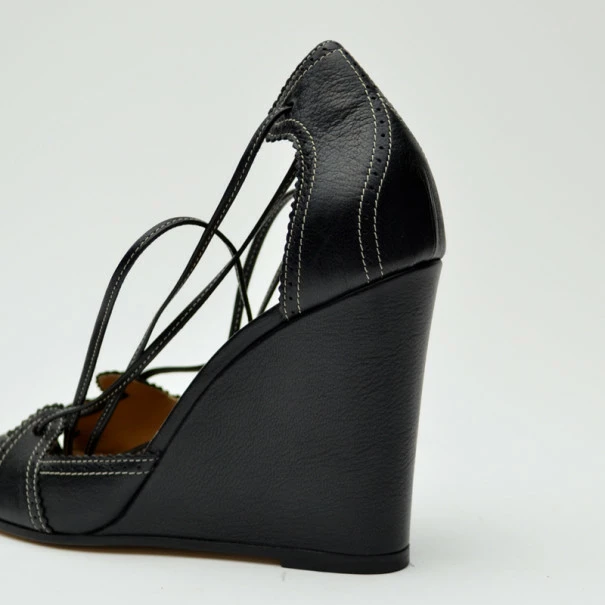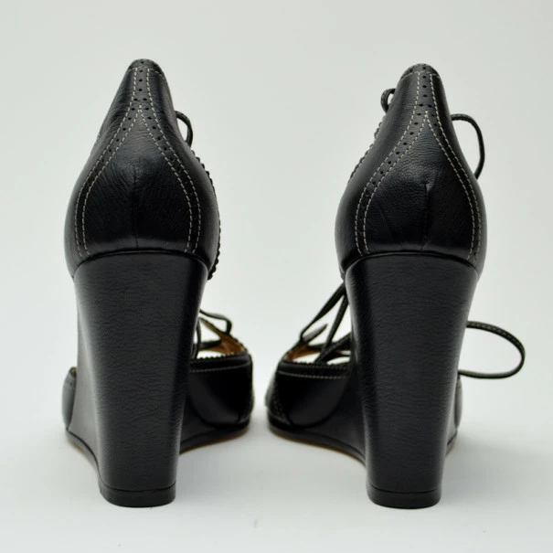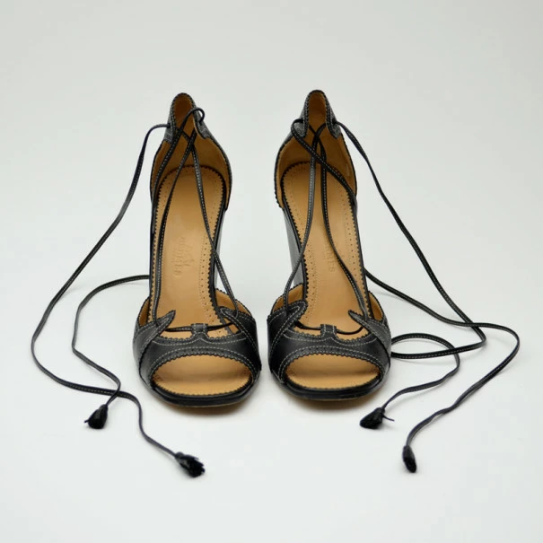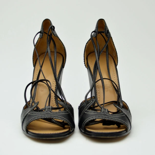 These fashion-forward Hermes wedges will certainly become a summer favorite! Crafted from black leather with perforated trim, these open toe wedges have distinctive white stitching, lace up fronts, and ankle straps with tassels. They have brown padded leather-lined insoles embossed with the Hermes labels.Gender: WomenCondition: Like New (These shoes are in excellent condition)Exterior Material: LeatherSize: 37Heel Size: 9 CMLining Material: LeatherIncludes: Original Box
