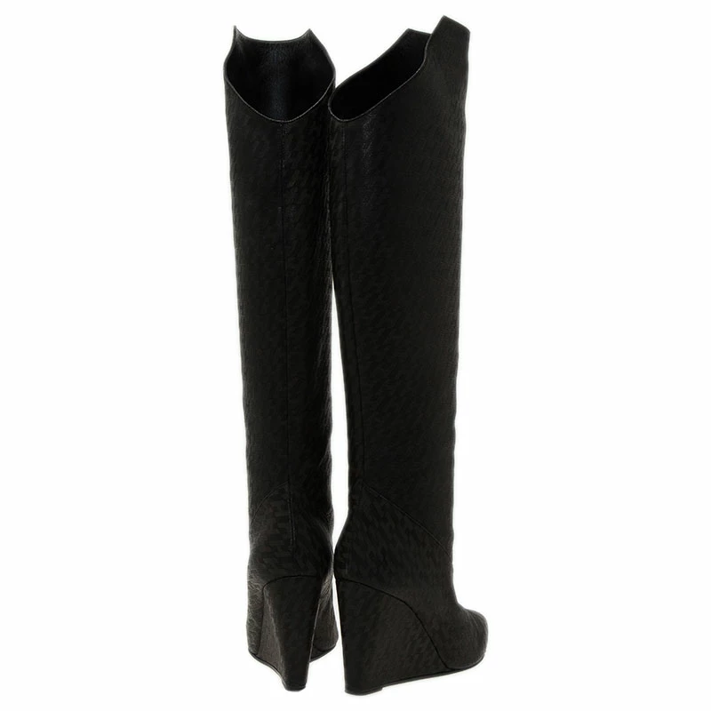 These tall wedge boots from Hermes will keep you warm and in style. Crafted from black monogram leather, these knee length boots feature pointed toes and 9 cm heels. The insoles are leather lined.