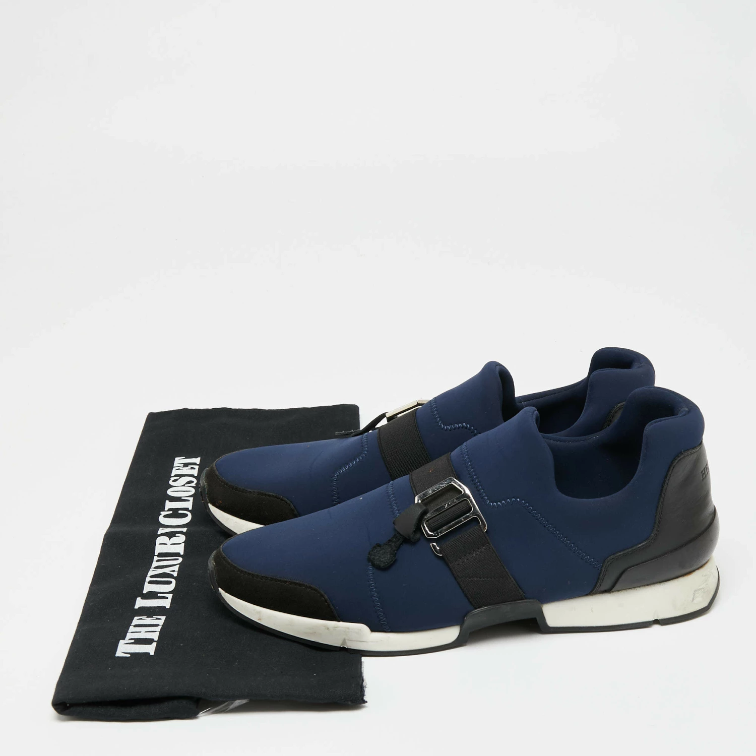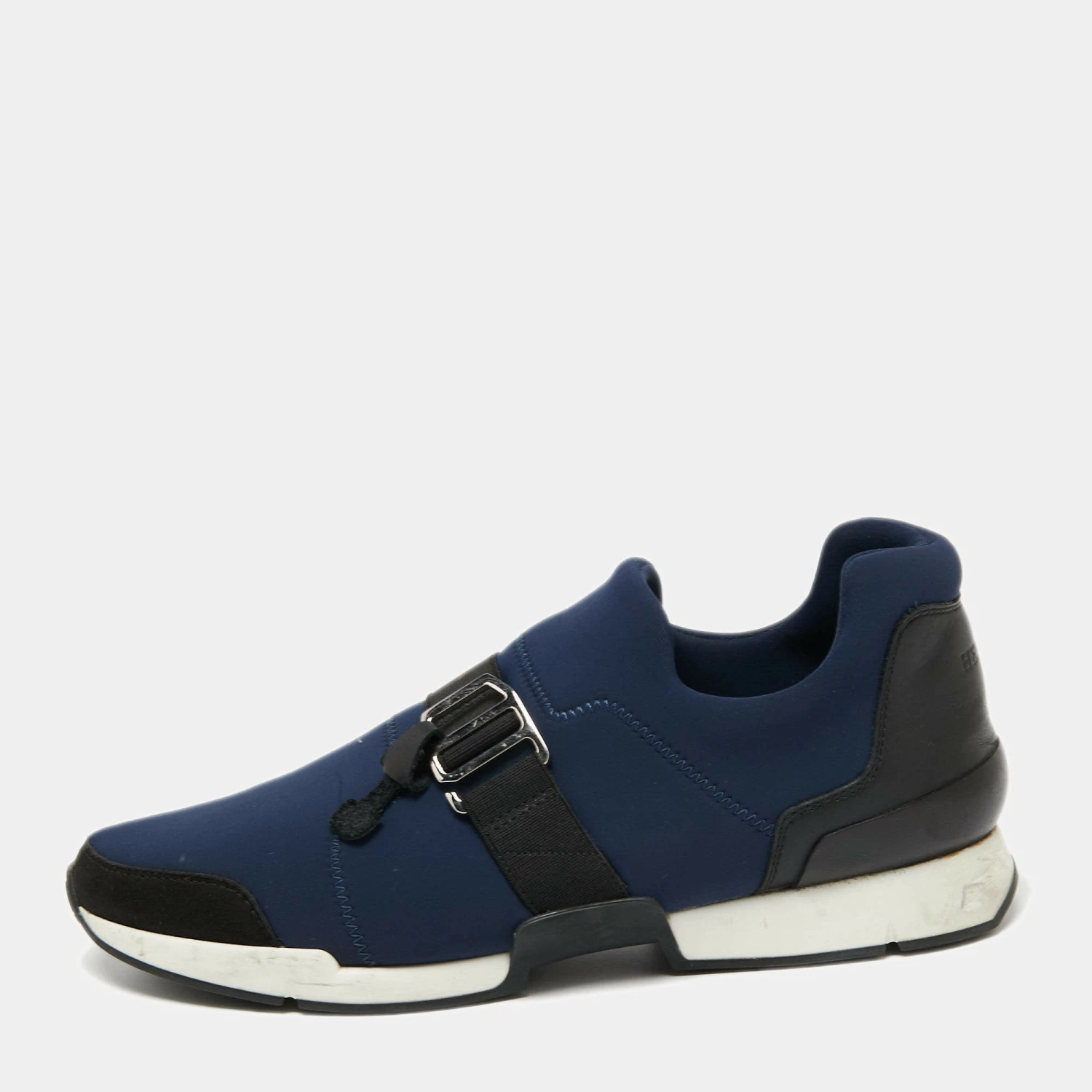 Easy to slip into, these sneakers from Hermes will be your new favorite casual pair! They have been crafted from black and navy blue leather and neoprene and are complete with smooth insoles as well as durable rubber soles. This pair can be worn with dresses or jeans for a chic look.