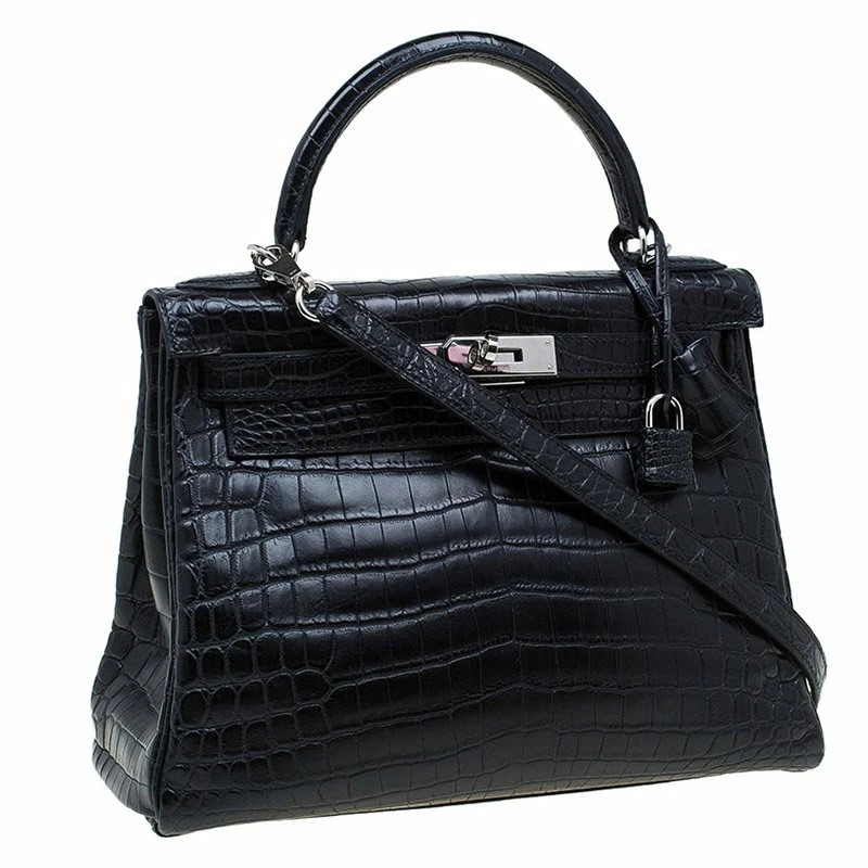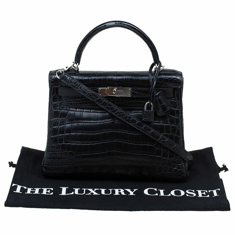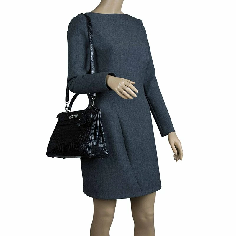 Inspired by Grace Kelly, the Hermes Kelly is coveted the world over. This Kelly Retourne bag is crafted with black leather and a crocodile finish. It features palladium hardware and has the signature turn lock closure. Two top handles, a shoulder strap, a clochette, and a padlock accent adds to its design.