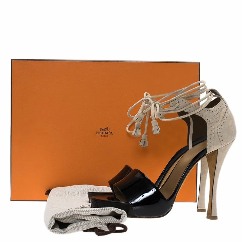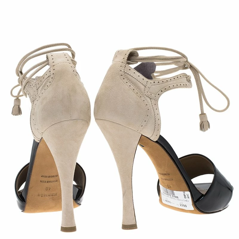 Hermes introduced their first women’s shoe collection in the 70s and have been dazzling the world with their gorgeous creations ever since. This pair of black and beige sandals feature ties with tassels at the ankles. The beige suede counters have dainty detailing, making their attention to detail evident. The vamps feature glossy, black cross straps.