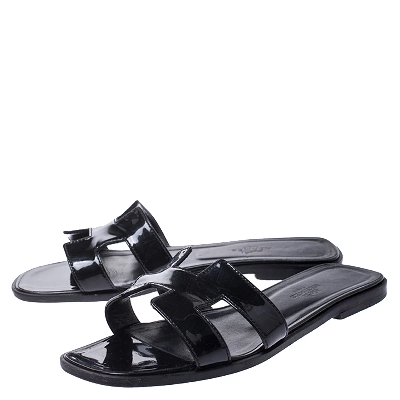 Put your best foot forward this season in these pretty Hermes sandals. These black Oran sandals have been crafted from patent leather in Italy and they feature the iconic H on the vamps as well as insoles meant to provide comfort at every step. These sandals are sure to attract admirers!