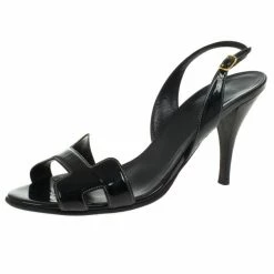 These patent Night Sandals from Hermes are a pair of simple and casual shoes. These slides have H shaped across the toes straps that are made from black patent leather with contrasting white stitching. It is finished with peep toes, ankle buckle straps and wooden 7 cm heels. The insoles are lined with leather that feature Hermes labels.Original Retail Price: US $860