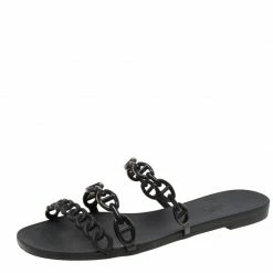A must have for the summers and for your vacations, these beautiful Hermes sandals are simple to pair with any day time look and chic enough to add a subtle statement to complete the look. Constructed in black rubber, the strappy vamps are designed in a chain pattern along with snug insole and flat design for comfort and ease.