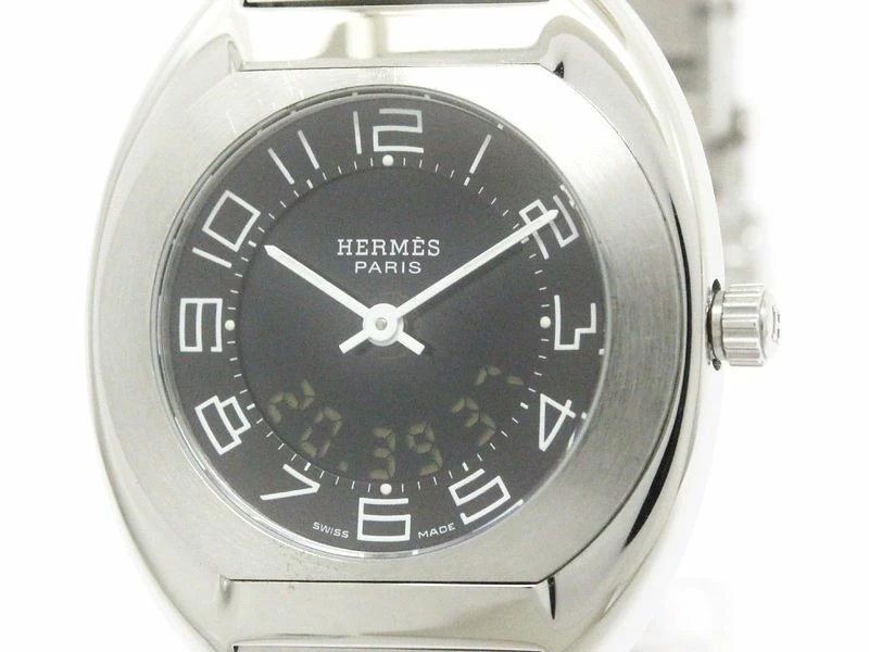 Hermes Espace features both analogue and digital displays. The digital functions include – local time, month, day and date, countdown timer, chronograph, second time zone, and alarm. Turn off the digital display by simply pushing the crown. The stainless steel bracelet strap offers convenience.