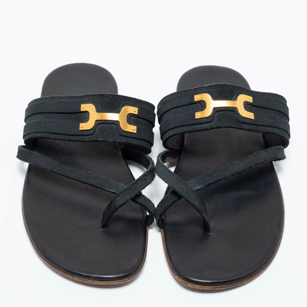 Relaxing and stylish, these sandals from Hermes will add a defining edge to your feet. Crafted from black suede, these flat sandals flaunt a toe ring and a slip-on feature. Gold-tone hardware adorns their upper. Bring these stunning sandals home and update your footwear collection!