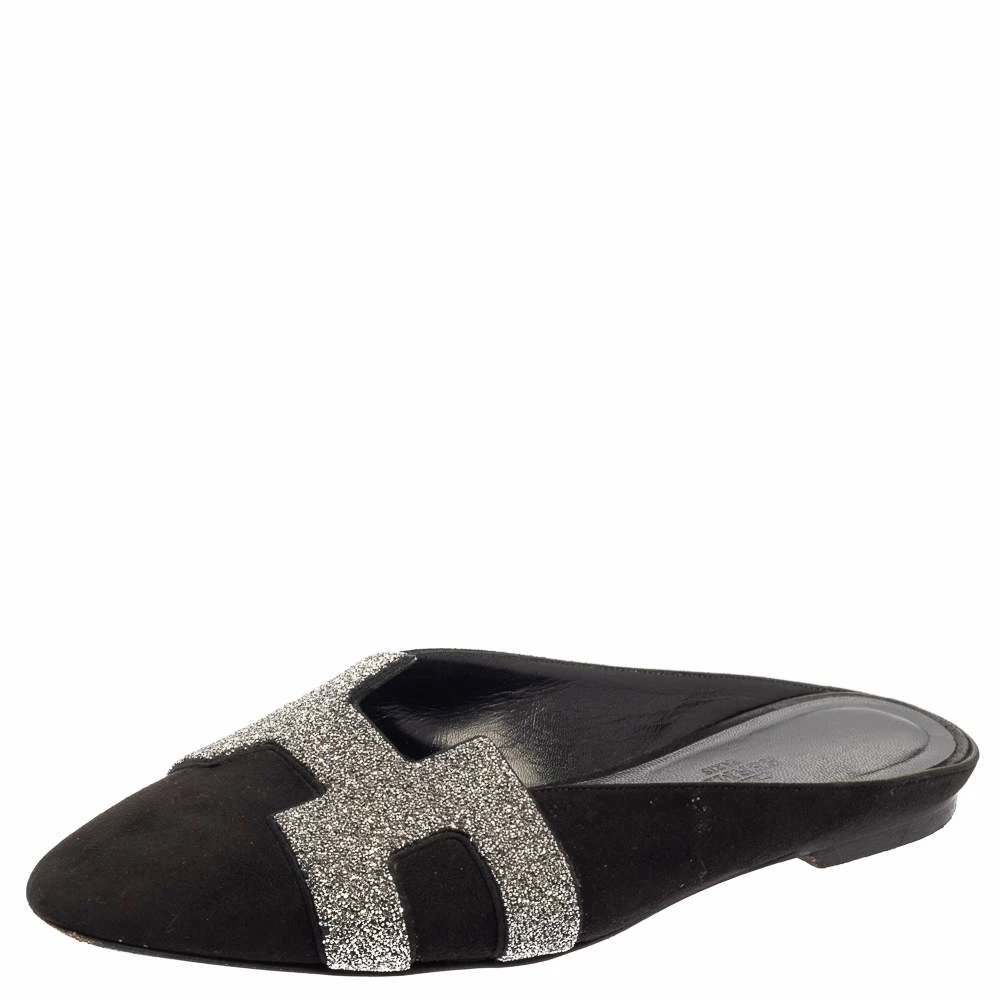 Leave your audience spellbound with this pair of Hermes mules. These suede mules have been styled with perfection just so a diva like you can flaunt them. Black in color, the pair has been designed with almond toes and the signature ‘H’ detailing on the vamps. They are equipped with comfortable leather insoles and durable outsoles.