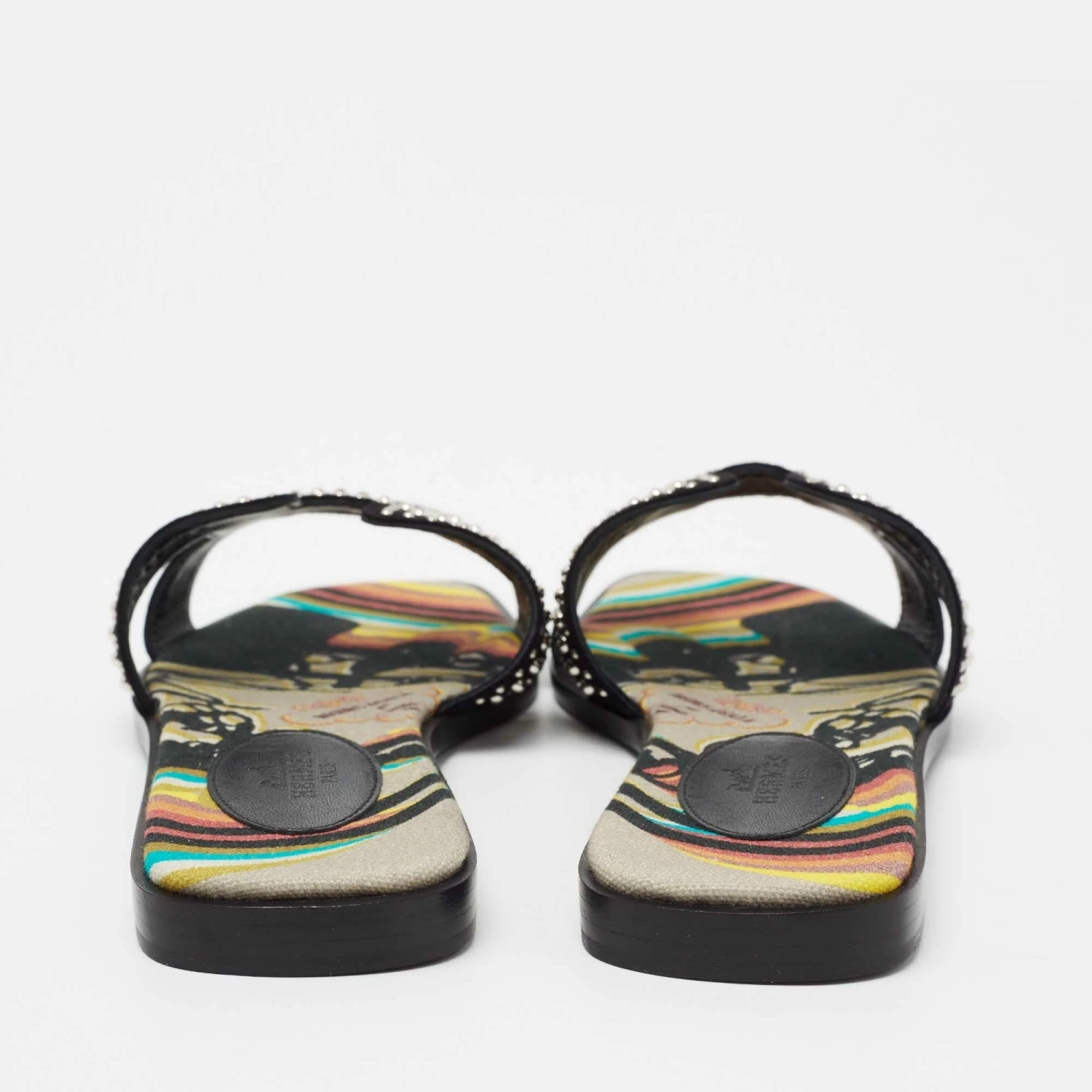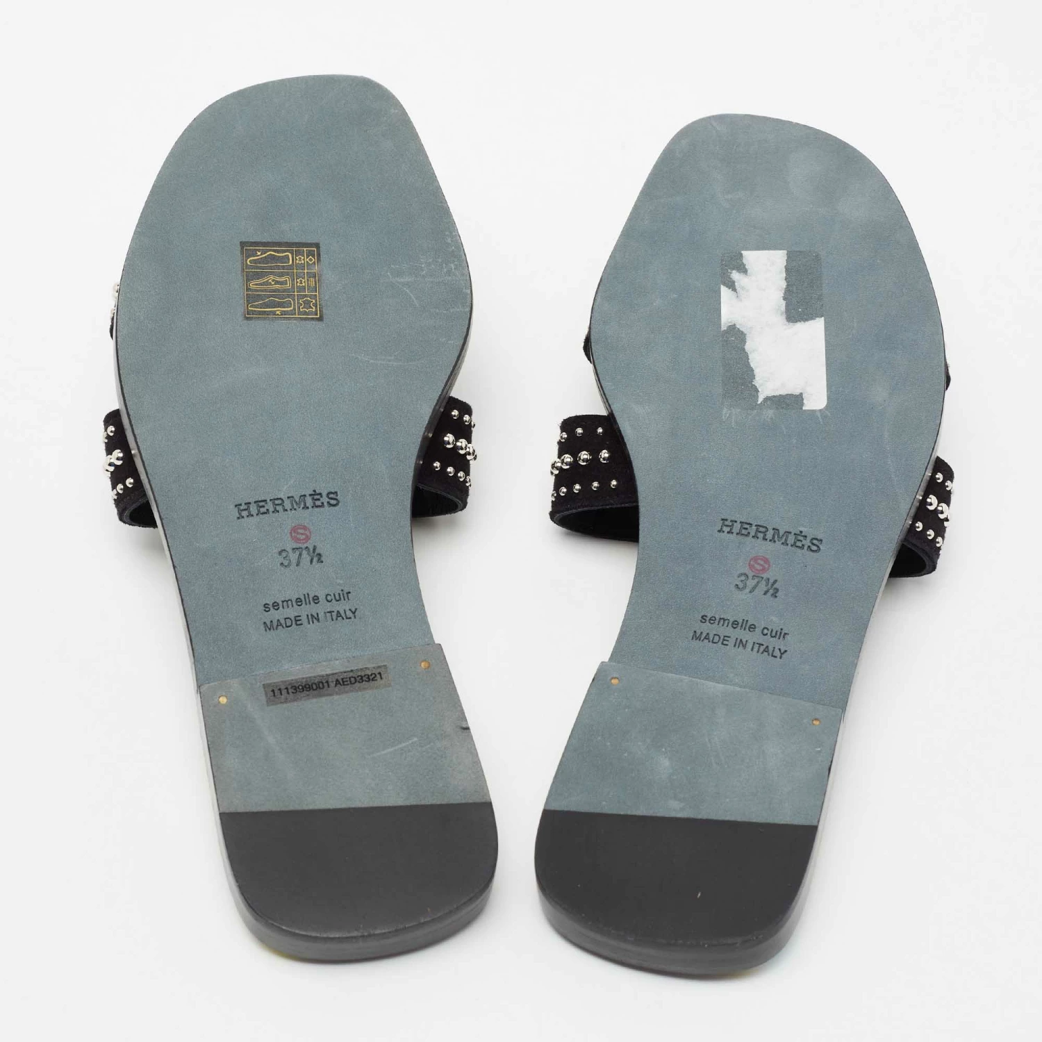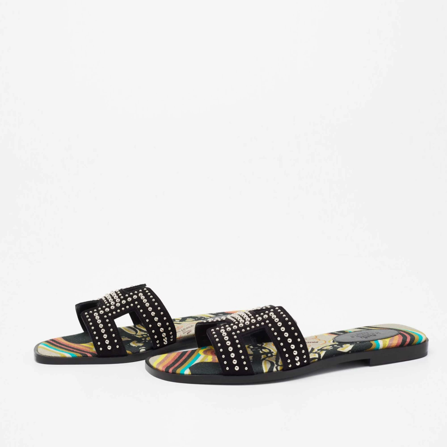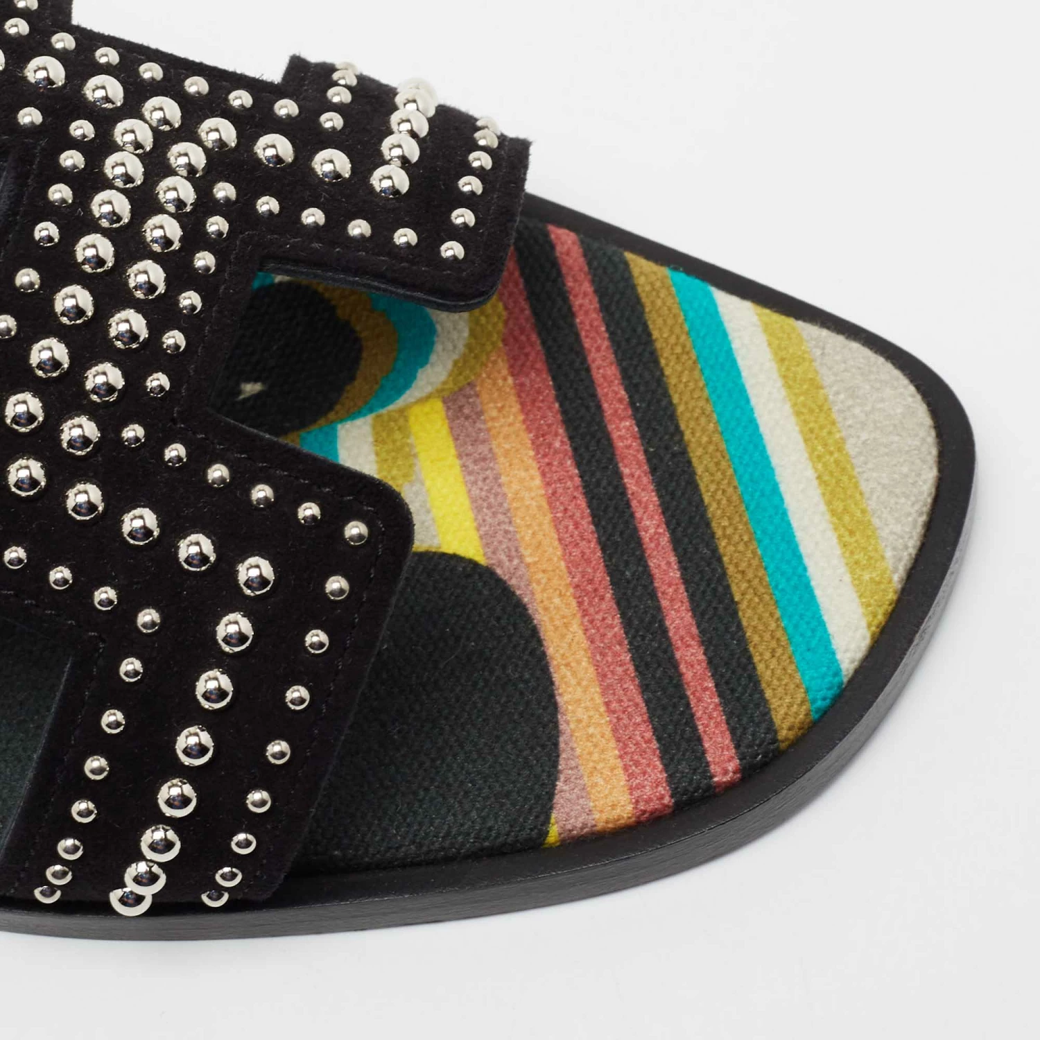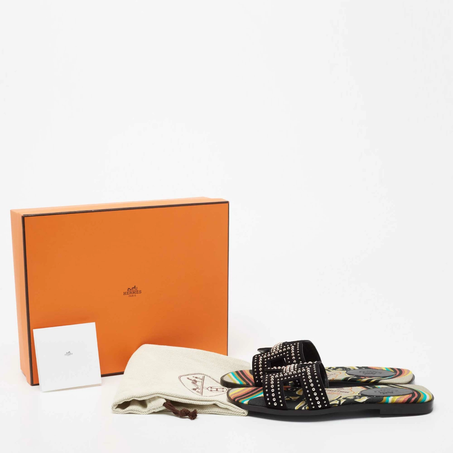 Add the iconic Hermès Oran sandals to your shoe collection with this pair. These black-hued flats have been crafted in Italy and they feature the iconic H on the studded vamps and lined insoles in leather to provide comfort at every step.