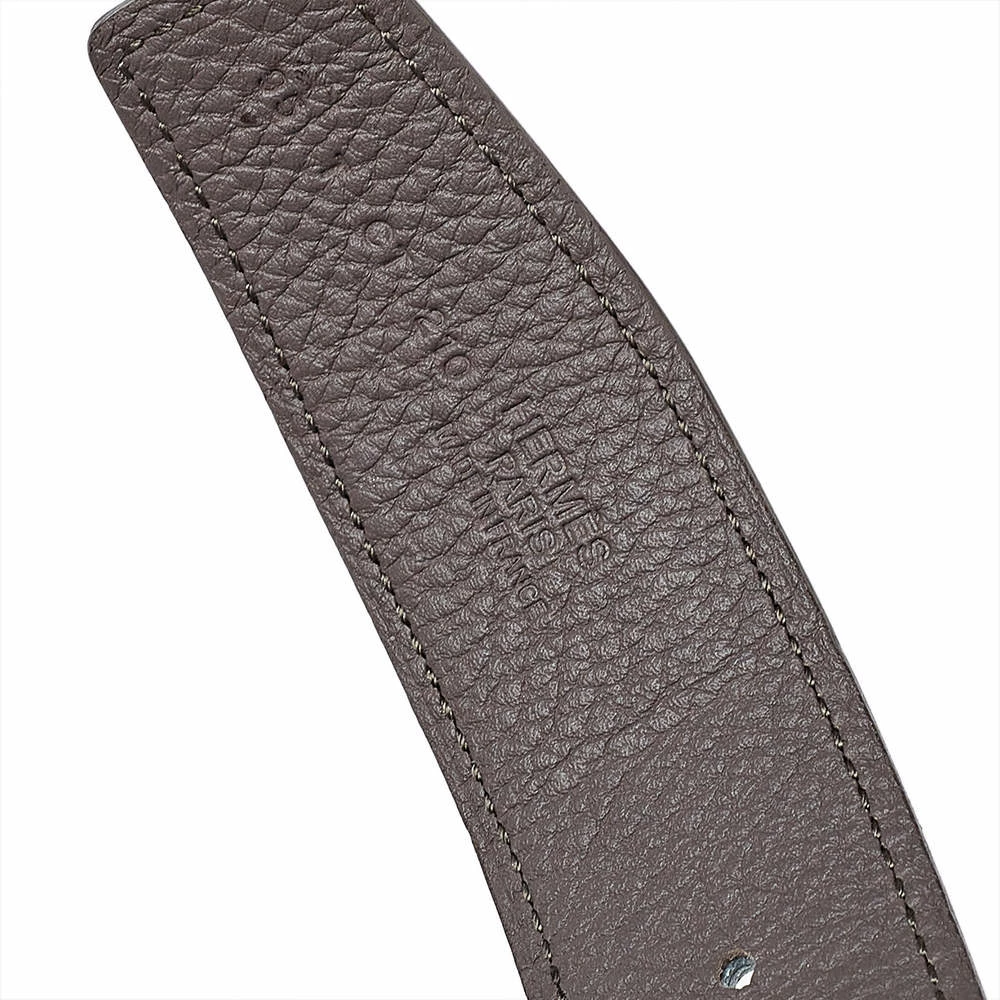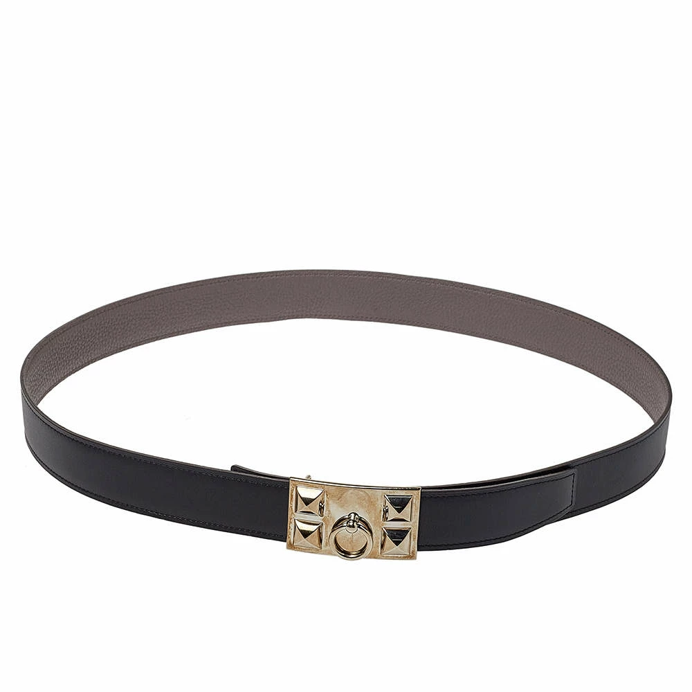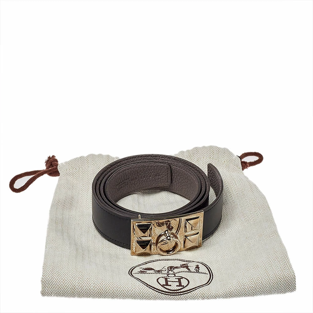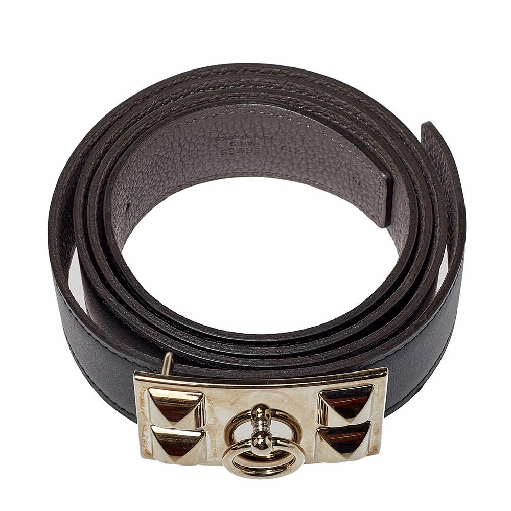 The story of the Collier de chien design began when the luxury house of Hermès designed a dog collar for one of its clients. The design had a central ring for the leash and pyramid studs. The custom-made piece eventually extended to fashionable accessories that people can wear. This reversible Collier de Chien belt is made from Swift leather on one side and Togo on the other. The signature buckle is in silver-tone metal.