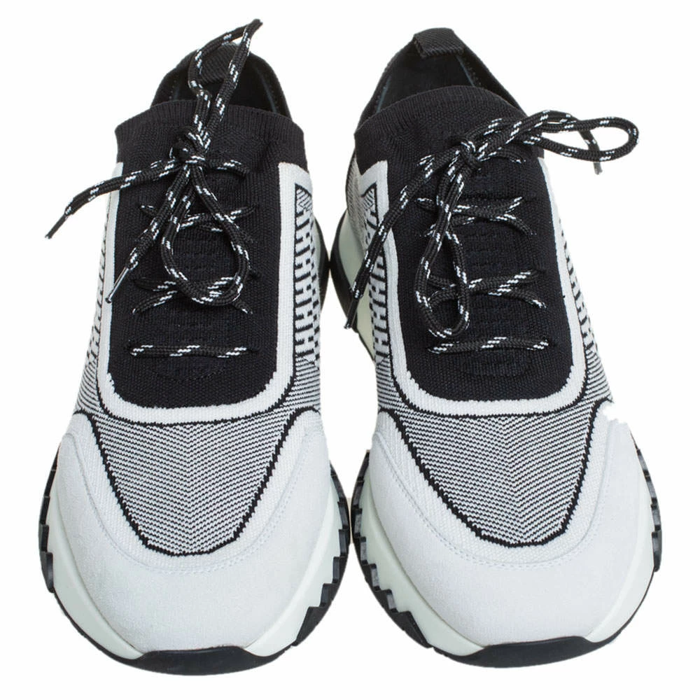 The Addict sneakers by Hermes present a classic style in a modern tone. These are crafted in knit fabric and suede to achieve an optical illusion effect. The sneakers are secured with lace-ups and equipped with rubber soles offering a good grip.