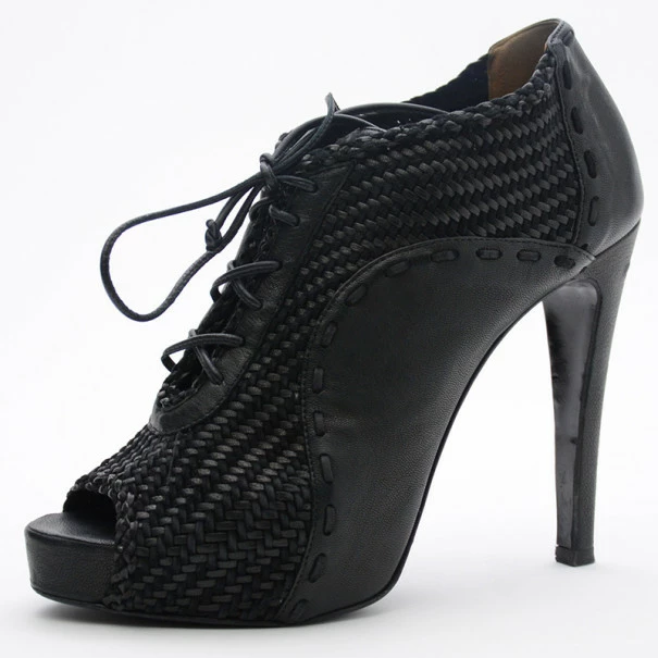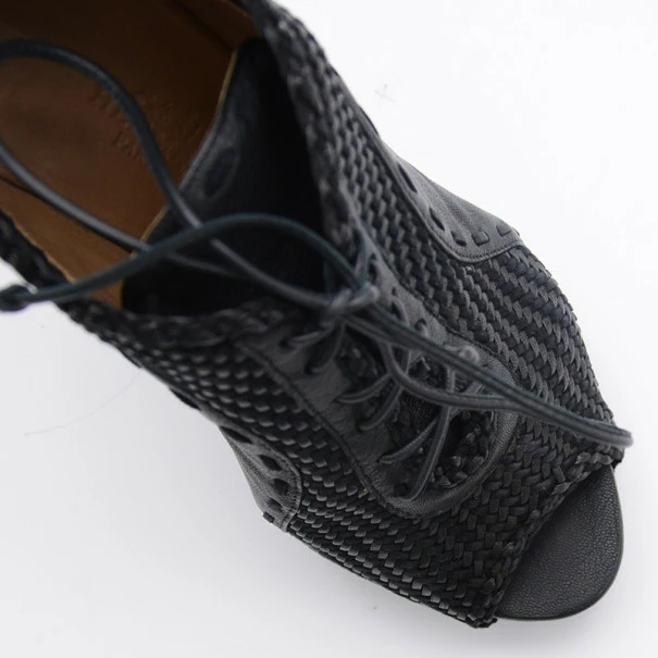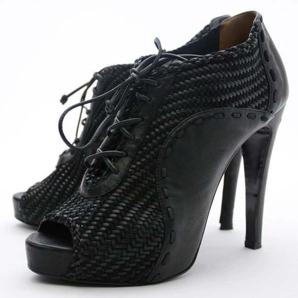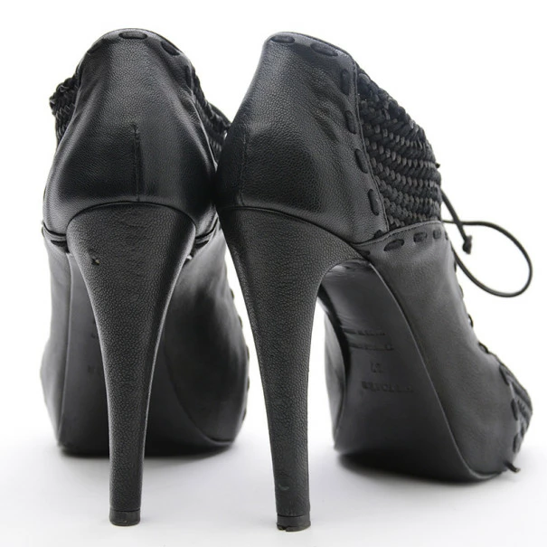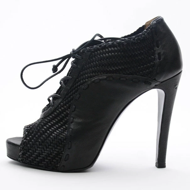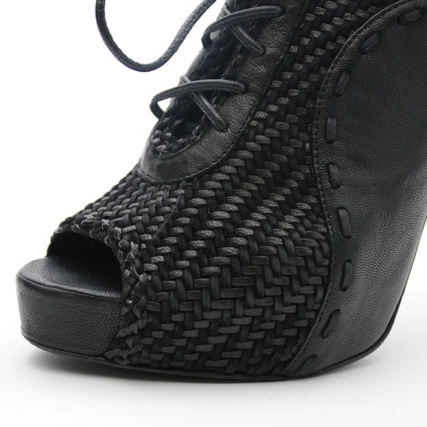 These Hermes Black Woven Lace Up Peep Toe Booties are just right to dress up your outfit. They come with 10cm heels and almond shaped peep toes. The lace up booties are leather lined. Original Retail Price:US $1,625