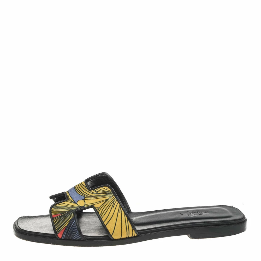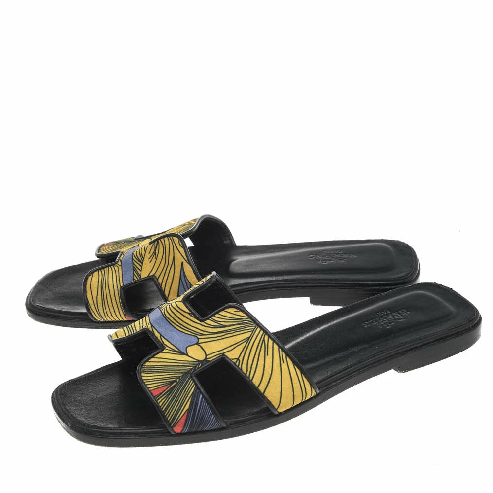 Hermes provides its audience with exclusive designs that are unfailingly modern and poised. These Oran sandals lend your feet a unique style and appearance like none other. They flaunt a cut-out H strap across the upper, which is crafted from black-yellow printed satin. Find true comfort as you walk in these sandals.