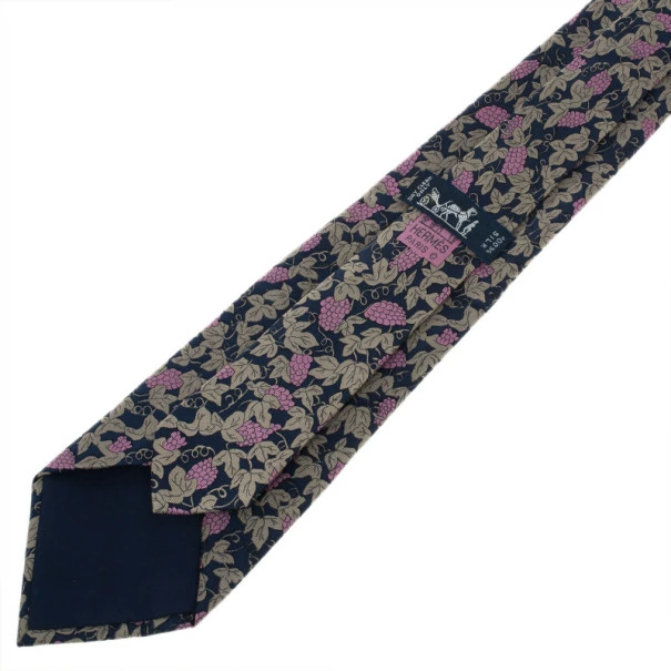 Inspired by vineyards, this Hermes tie will give your day a fresh look. Its navy blue silk is printed with mauve grapes and light grey grape leaves.