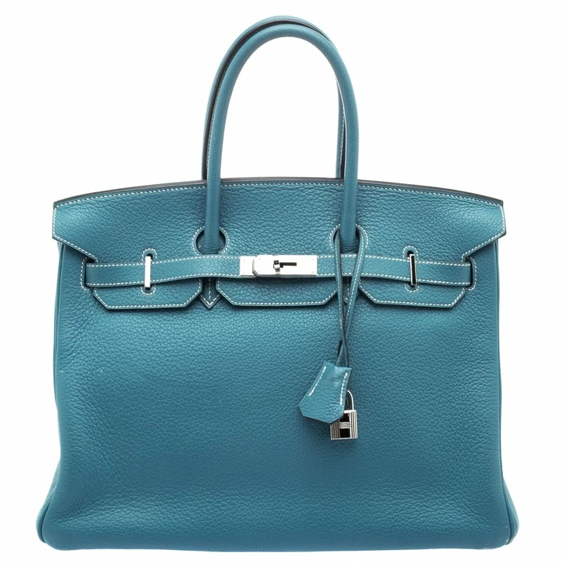 The ‘it’ bag, the mother lode of all handbags ever created- the Hermes Birkin 35, is one of the most iconic bags and never goes out of style. A standout addition to your collection, this bright blue Azure bag is made from baby bull, ‘veau taurillon clemence’ or Clemence leather. Popular since the 80’s this exotic leather is known for its high durability, big and flat grains.With enough room to carry your everyday essentials and more, it has a slip pocket inside to keep your valuables safe. Silver-tone padlock and leather clochette add to the look. High quality and flawless craftsmanship are two virtues that make Hermes’ creations worth investing upon. And why not, when these masterpieces retain their legacy and increase their value year after year.