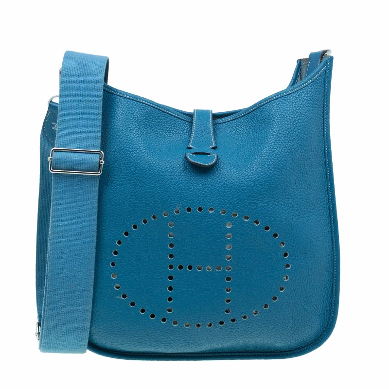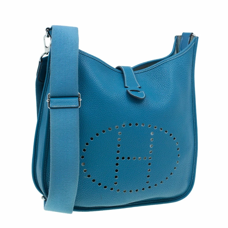 Add a splash of color to your everyday outfits with this Hermes Clemence bag. It features a gorgeous bright blue color textured exterior with a perforated H logo in the front and a removable,adjustable shoulder strap. The cross over strap on the top with snap closure opens up to unlined interior.
