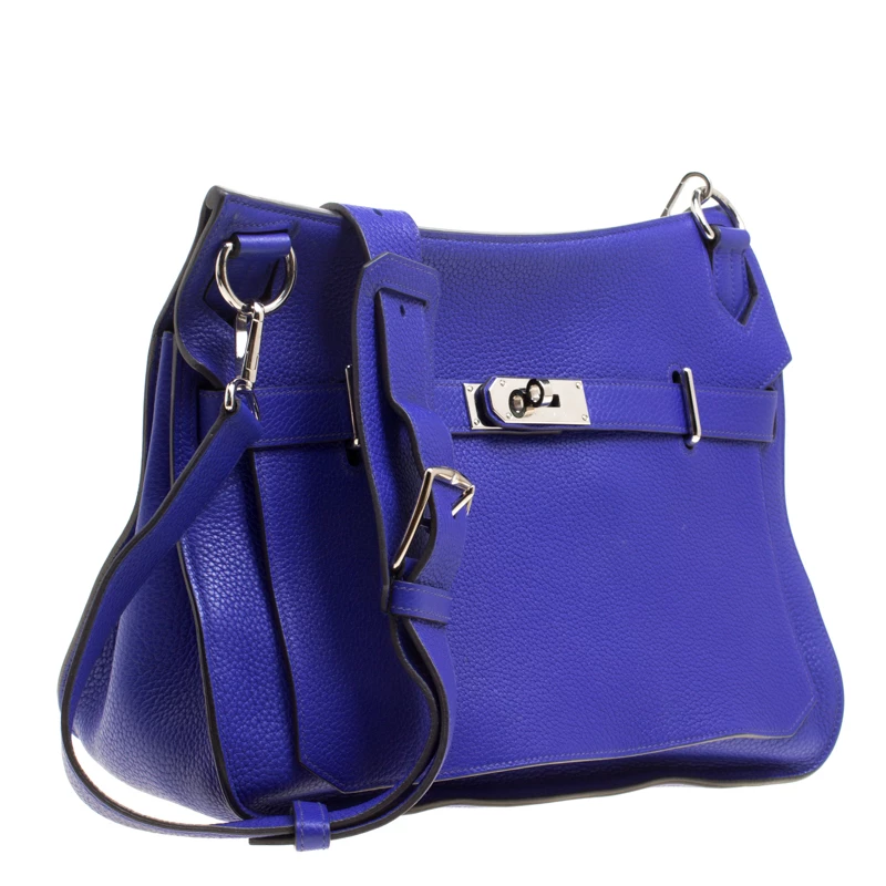 Hermes Jypsiere is a re-interpretation of the iconic Hermes Kelly. The messenger style bag is crafted from Blue Clemence leather. The bag has a round bottom and features a thick adjustable shoulder strap that provides the needed comfort. The front flap has a turn lock closure and opens to a leather lined interior that houses two slip pockets and a zip pocket. This versatile bag can be worn over the shoulder or crossbody.