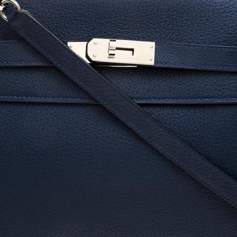 Inspired by none other than Grace Kelly of Monaco, Hermes Kelly is carefully hand stitched to perfection. This Kelly Retourne is crafted from Blue De-Presse Togo leather and has palladium hardware. Retourne has a more casual look and is stitched on the inside thus making its edges softer. The bag comes with the signature kelly closure, single top rolled leather handle, a detachable shoulder strap and a padlock with its keys within the clochette. The interior is leather lined and houses a zip pocket. Kelly 32 can fit in all your daily necessities and more. Easy to carry, this investment piece will stand out in your bag collection.
