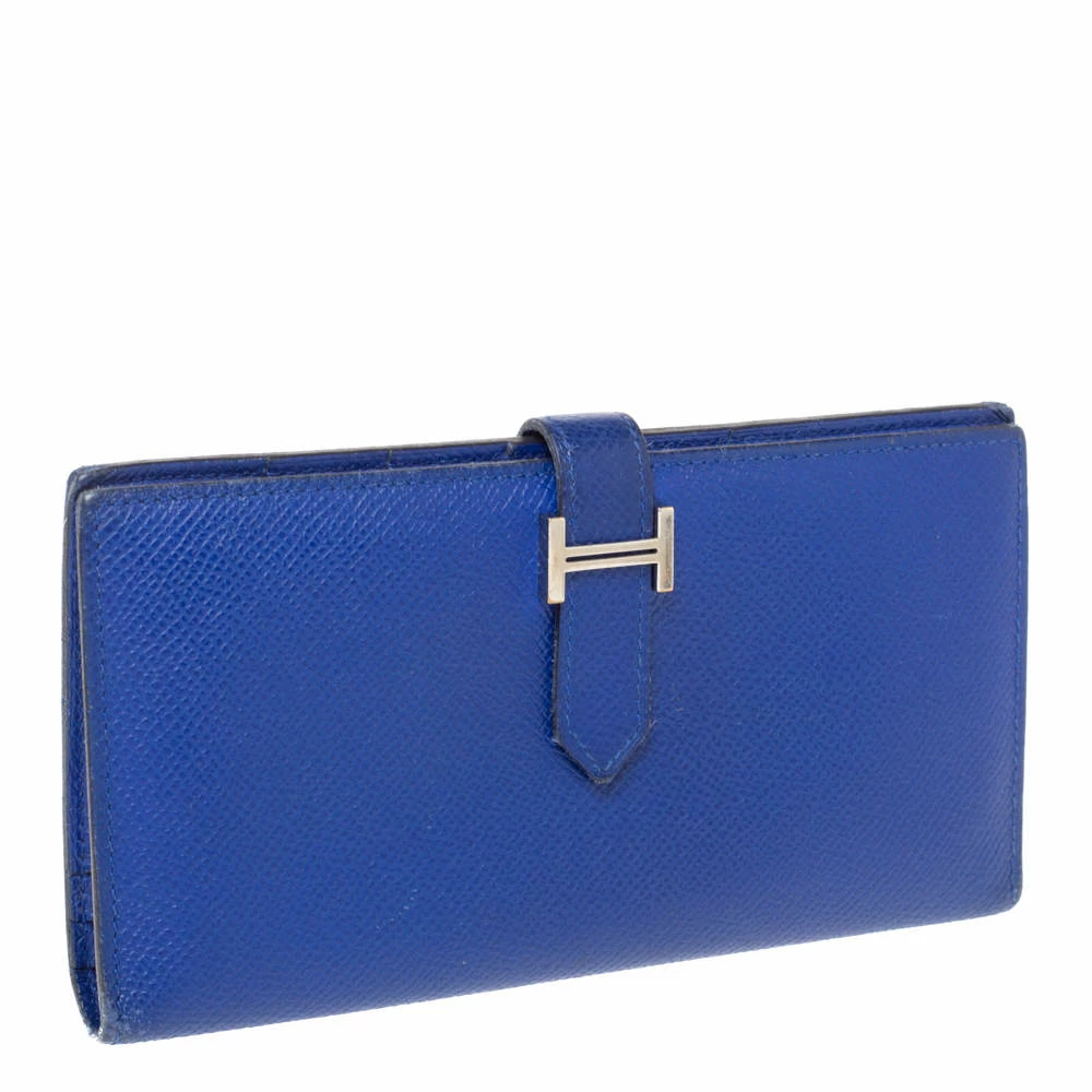 Luxuriously crafted by the experts at Hermes, this stunning Bearn Gusset wallet is a must have accessory for the luxury fashion lovers. Crafted in leather, this wallet carries an elegant appeal and a sleek silhouette. It features a silver-tone H on the front strap button closure that opens to a leather-lined interior to complete the look. The interior is composed of multiple card slots, slip pockets and one zip pocket where you can conveniently store your cards, cash and bills. This wallet is a charmer that can be carried solo in the hand and can be stowed easily in one of the brand’s luxury bags.