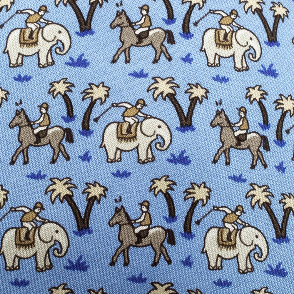 This suave silk tie from Hermes is perfect for the dapper man. Designed with an elephant and horse jockey print, this blue tie comes with the brand label keeper loop at the back. The tie can be styled with various outfits.