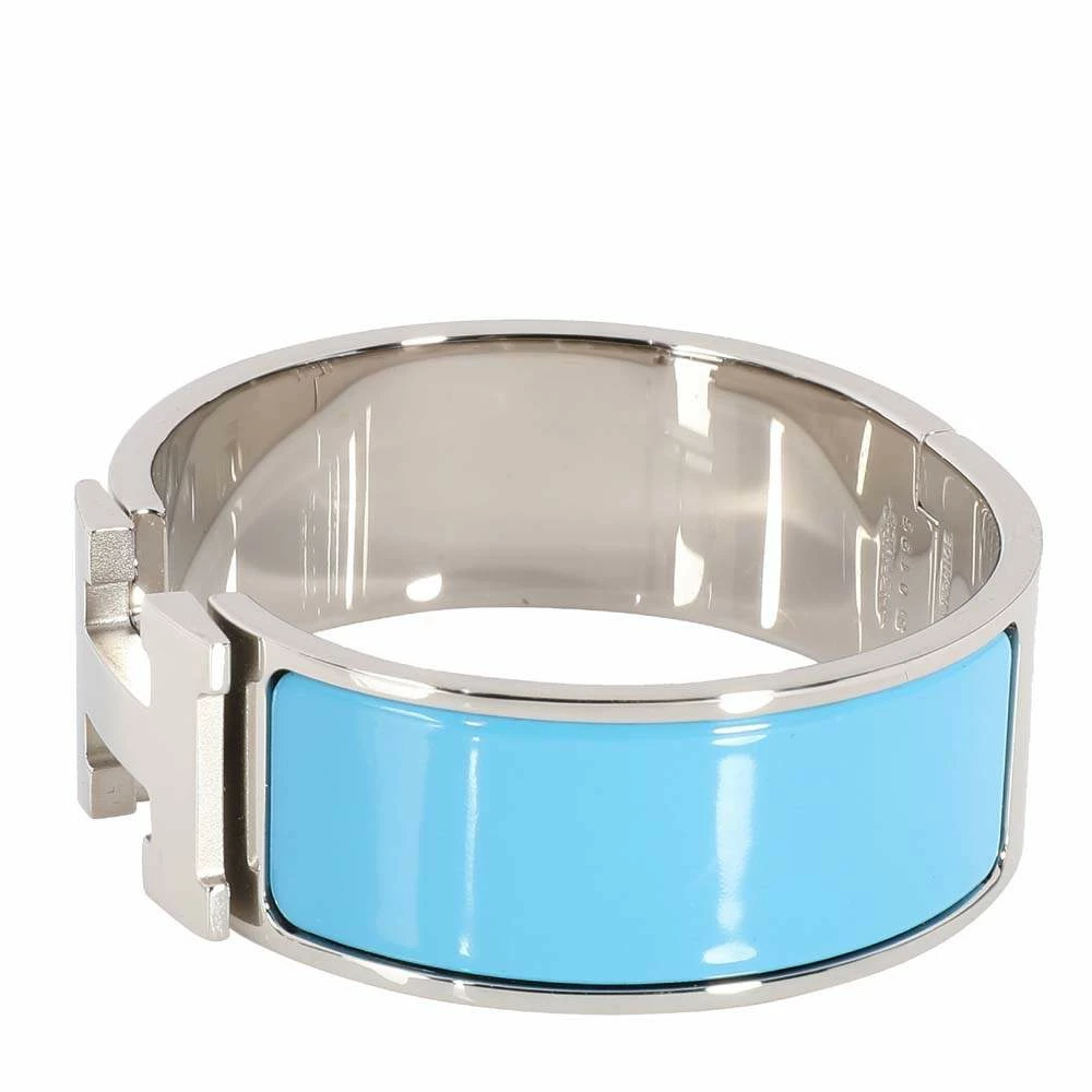 Exude charm with this eye-catching bangle from the house of Hermes. The bangle features a wide steel band with a bright blue enamel inlay. The locking hardware is designed to resemble the brand’s logo. You can pair this modern bangle with a short jacket and a silk top with fitted pants.