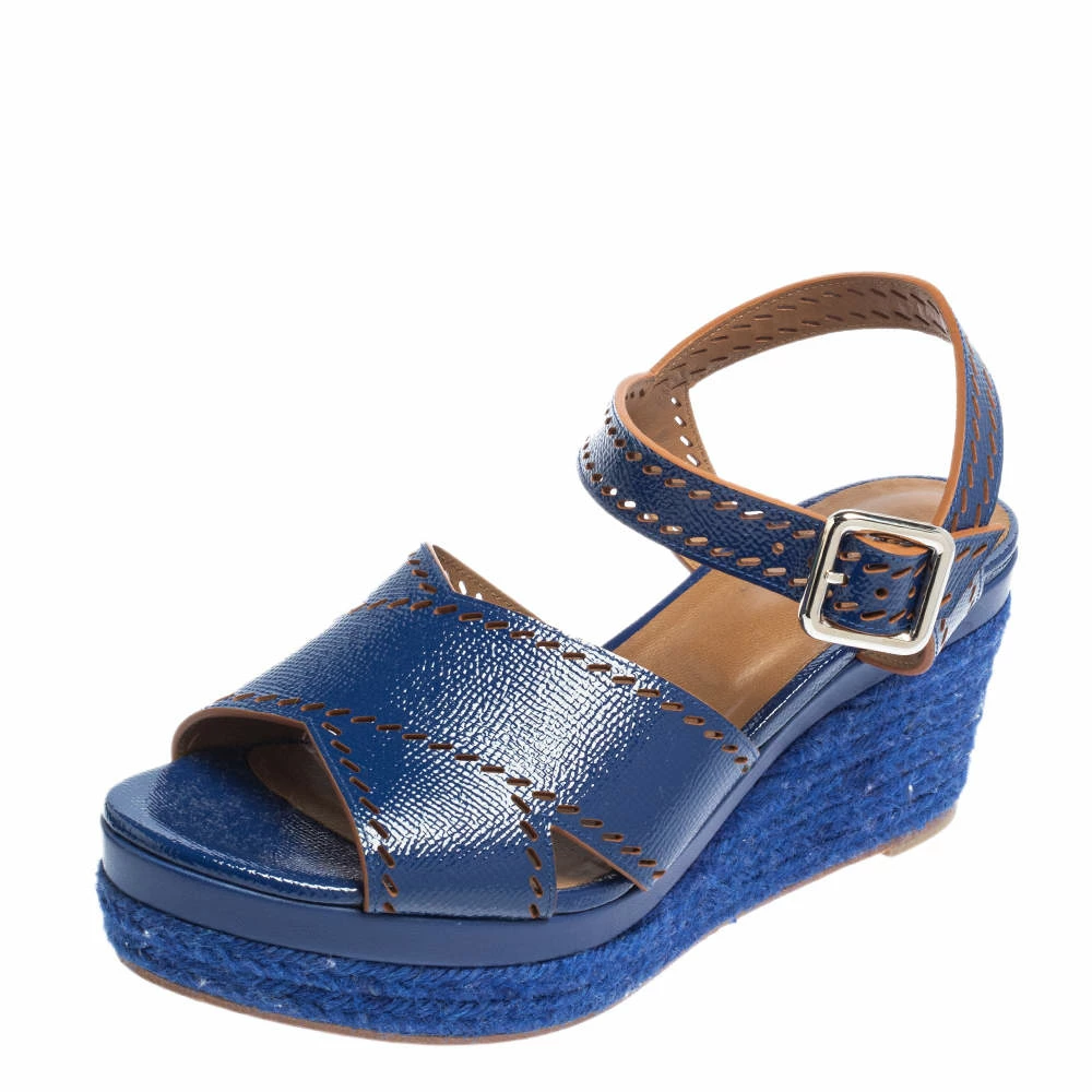 These blue sandals by Hermes have been designed to be comfortably stylish. Crafted from glossy leather, they feature perforated accents, open toes, ankle buckle fastening, and espadrille wedges. They’ll look great with dresses and casual outfits.