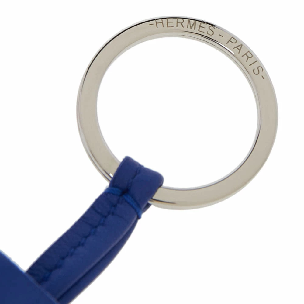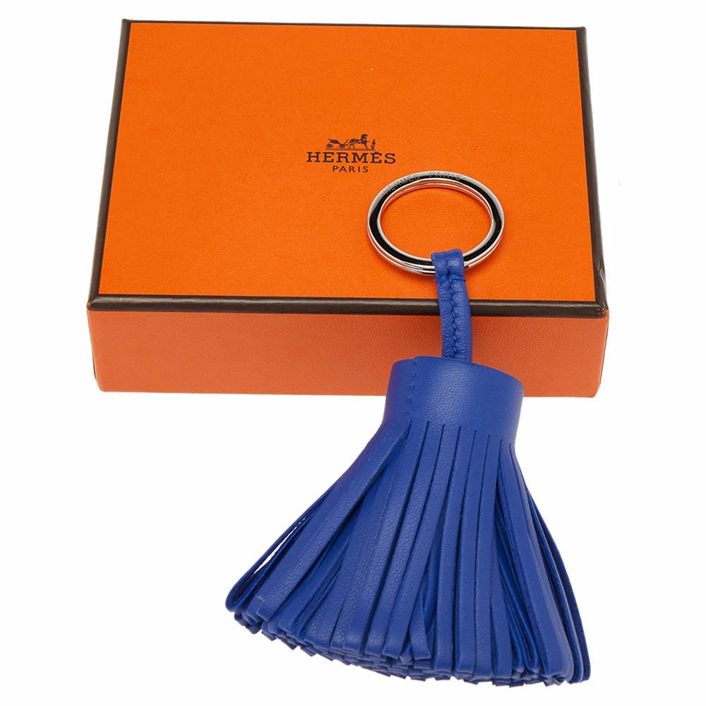 This classy keychain is designed by Hermes. The keychain features a blue leather tassel and an attached, label engraved ring. This creation will certainly add to the charm of your personality.