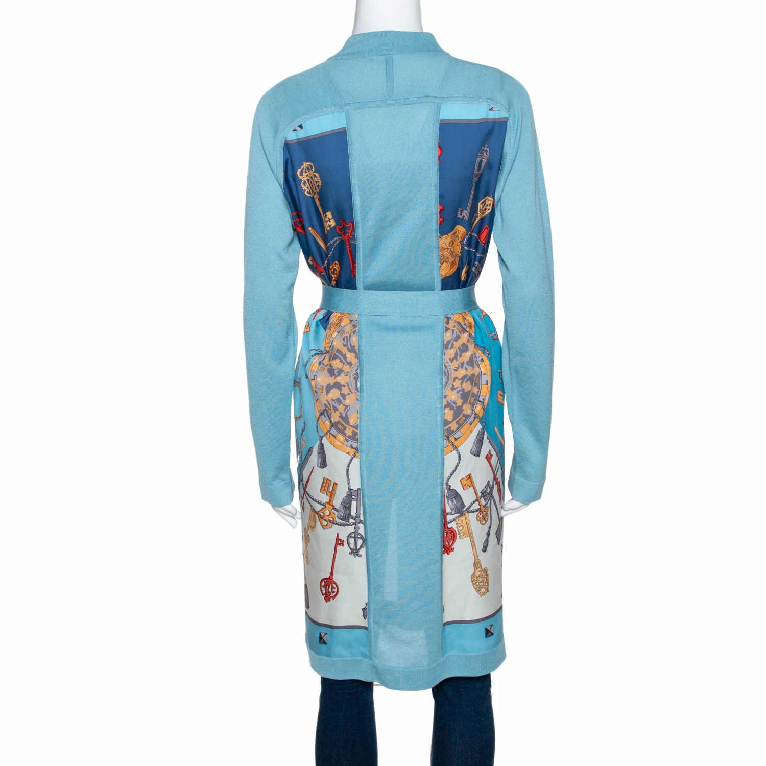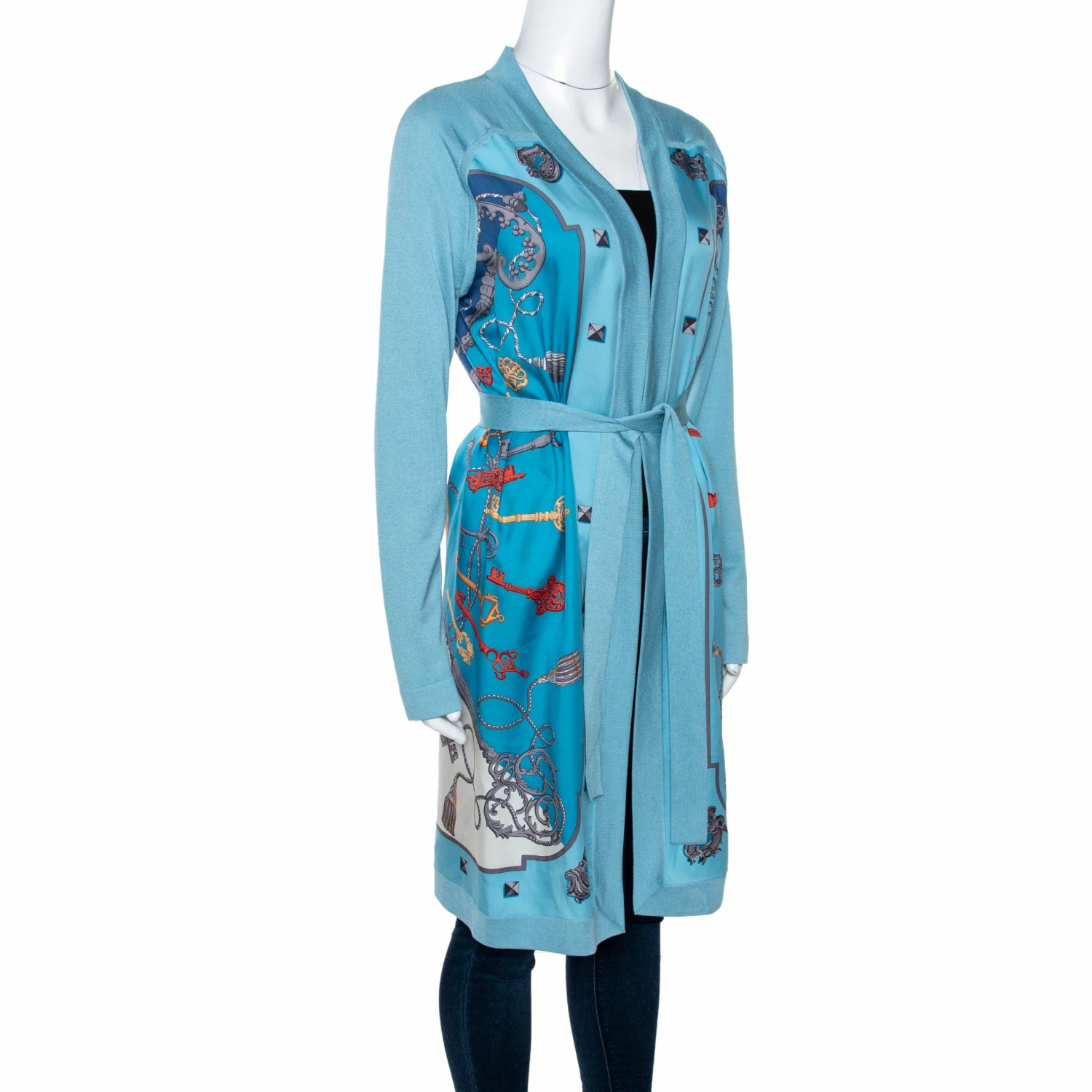 This fabulous cardigan from Hermes is a versatile creation that definitely deserves a place in your wardrobe! It is made of silk and features a lovely blue shade all over. It flaunts an elegant print and a long silhouette. Long sleeves and an open front complete this piece. Pair it with a solid-colored dress and boots for a chic appearance.