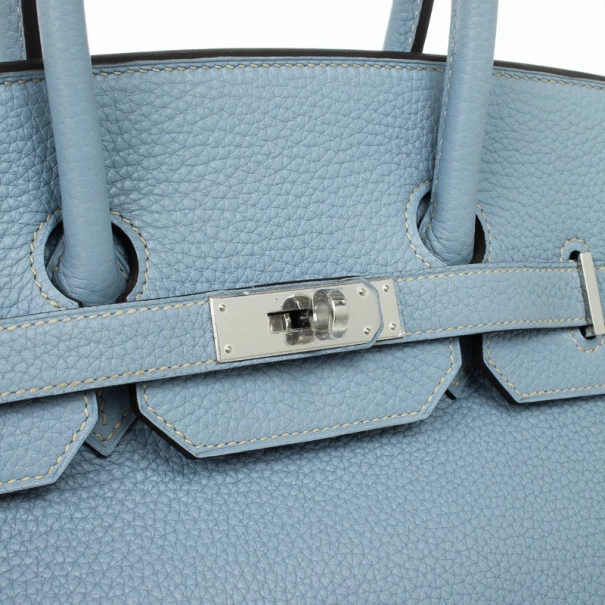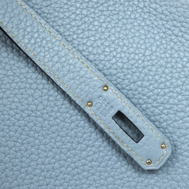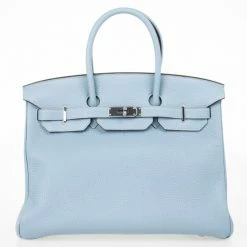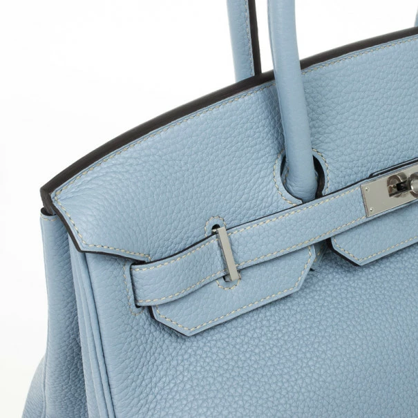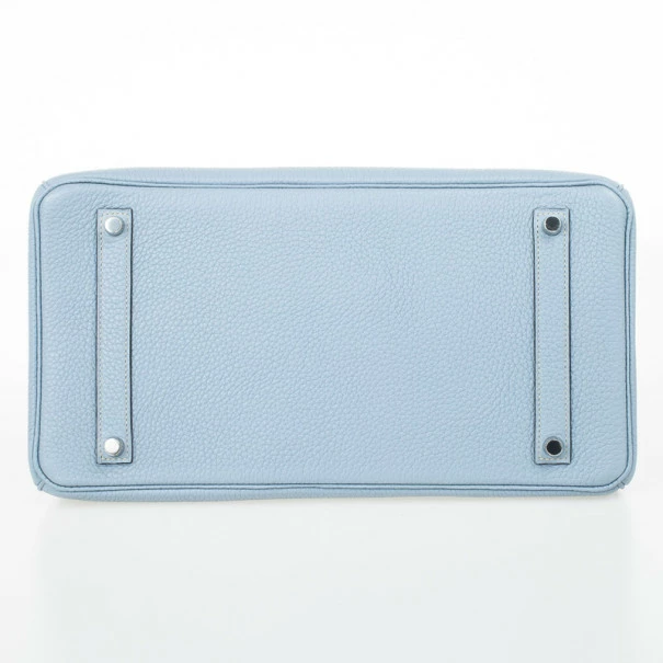 This classic Birkin from the luxurious label Hermes will get you through all seasons. Crafted from light blue leather, the iconic shaped exterior has a flap opening and is detailed with a turn lock closure, a leather clochette, silver feet and rolled leather handles. The spacious leather interior houses a zipped and one patch pocket for securing your belongings.Final Sale. No returns.