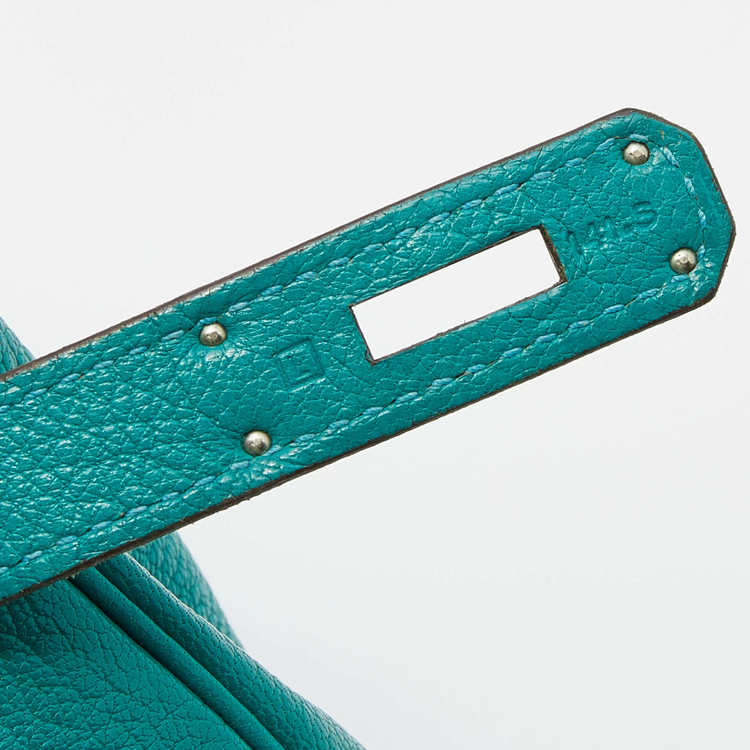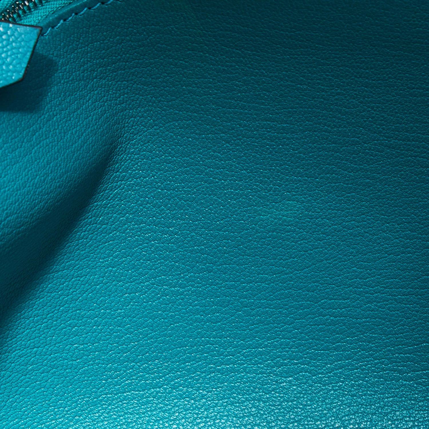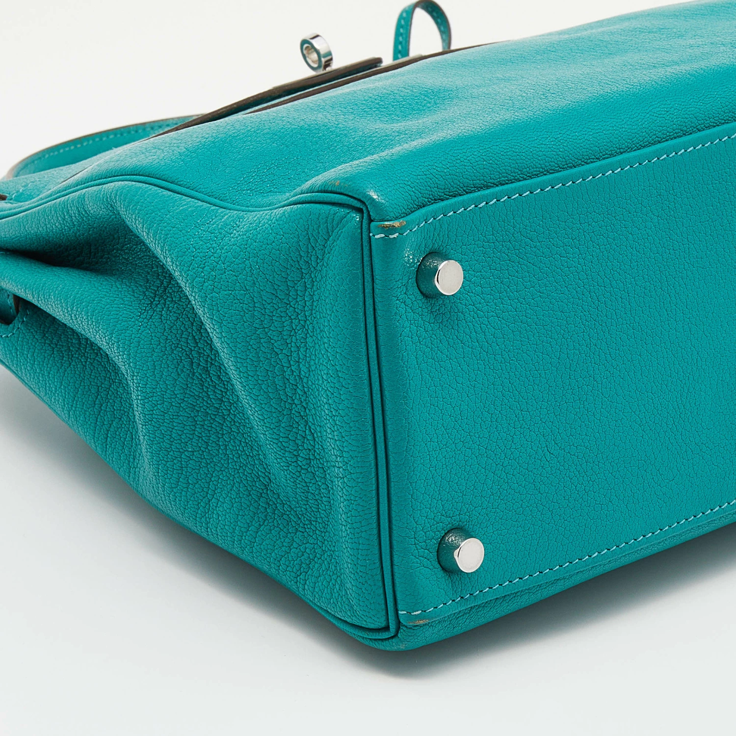 Created by Robert Dumas, the Hermes Kelly is an enduring symbol of luxury. Handstitched using the finest materials and fitted with notable elements, the bag is recognizable at first glance. This authentic Blue Paon Kelly Retourne 32 is crafted from Chevre leather and has palladium-plated hardware. The bag comes with a turn-lock closure, a single top rolled leather handle, a bag strap, and a clochette. The leather-lined interior houses enough space to easily fit in all your daily necessities. Make haste and invest in this beauty today!