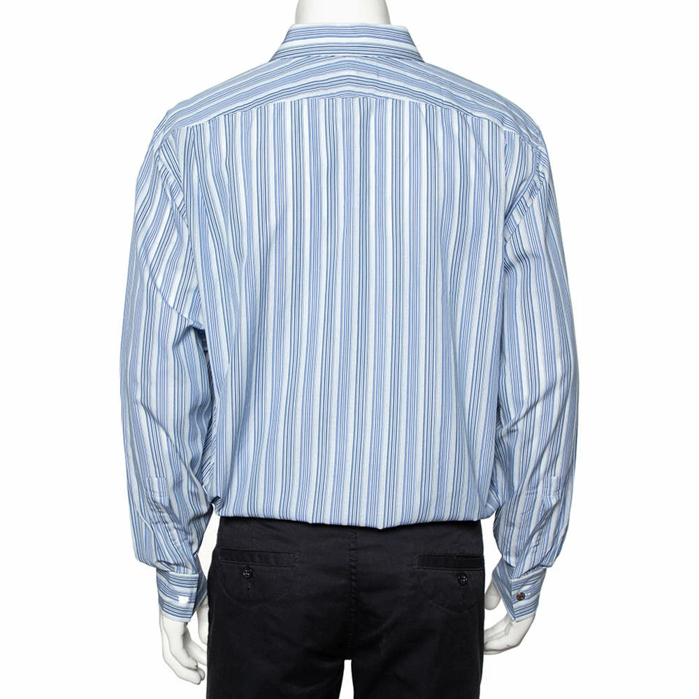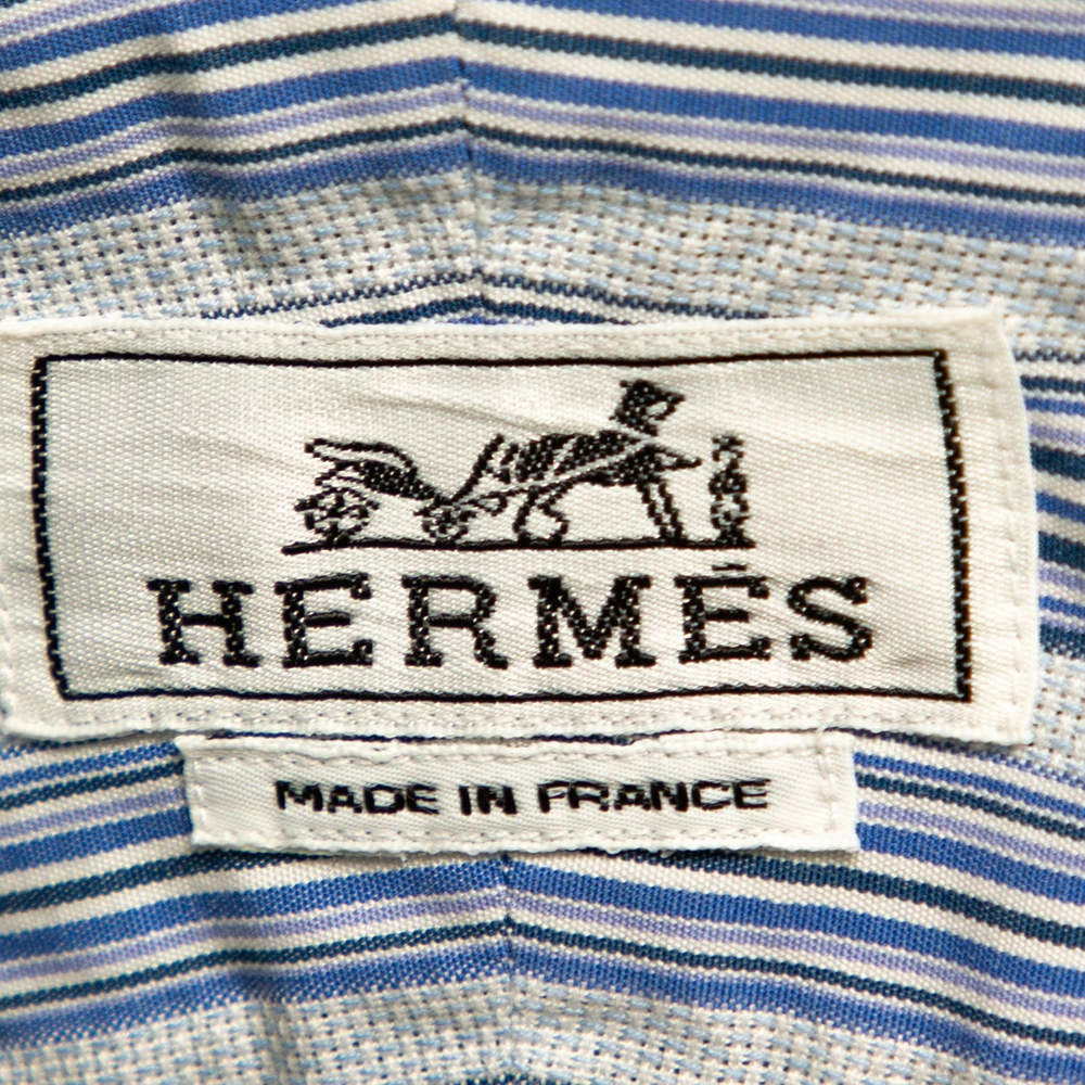 Smart and stylish, this shirt from Hermes offers a classic style and silhouette. The blue shirt is made of cotton and features a striped body. It flaunts front button fastenings and long cuffed sleeves. Pair it with tailored pants to work and look your fashionable best.