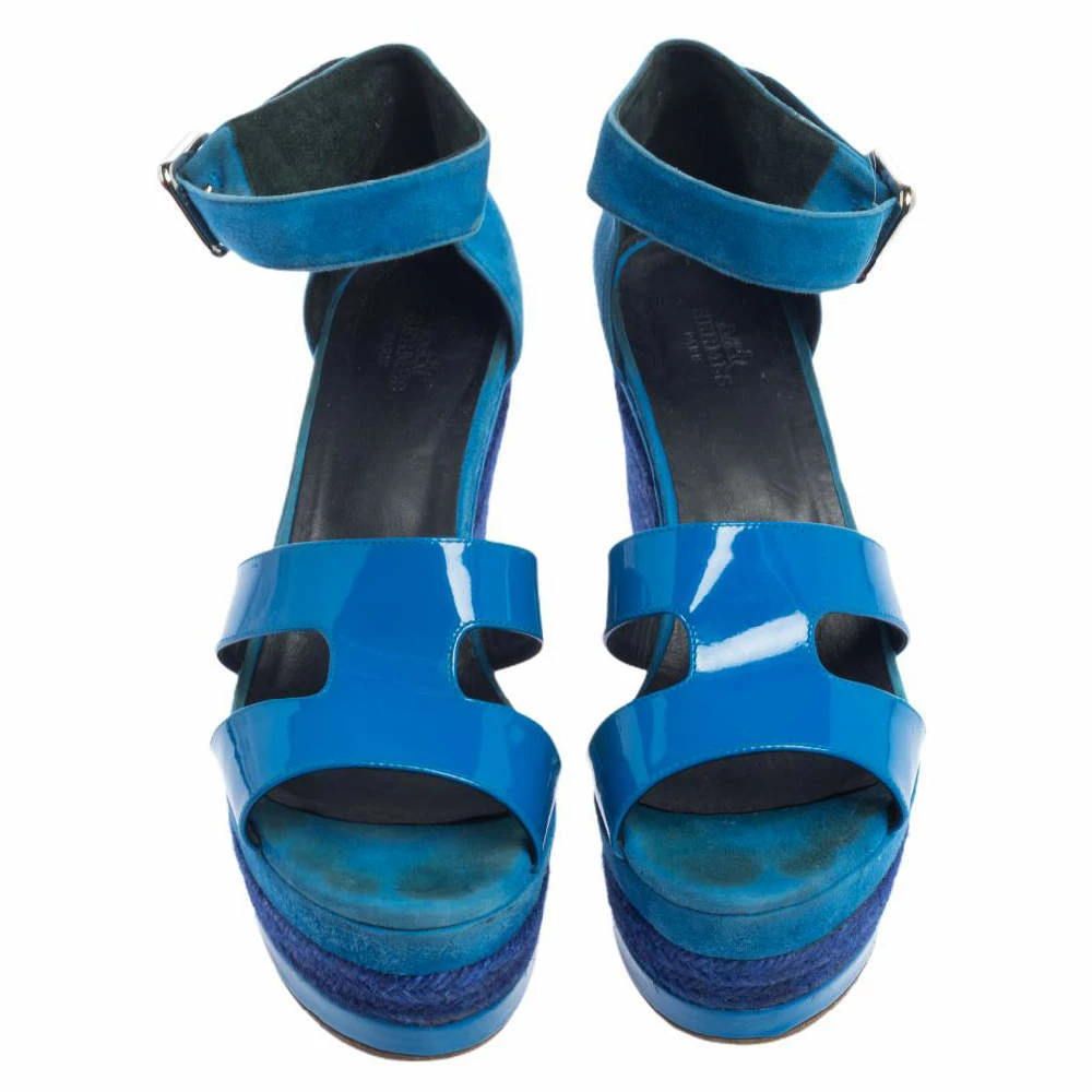 Exhibit comfortable luxury when you step out in this lovely pair of sandals from Hermes. The pair has been designed with front H straps in patent leather and the covered counters with ankle fastenings are in suede. But it is their set of 9cm espadrille wedges that makes them such a standout design.