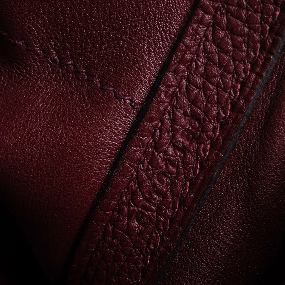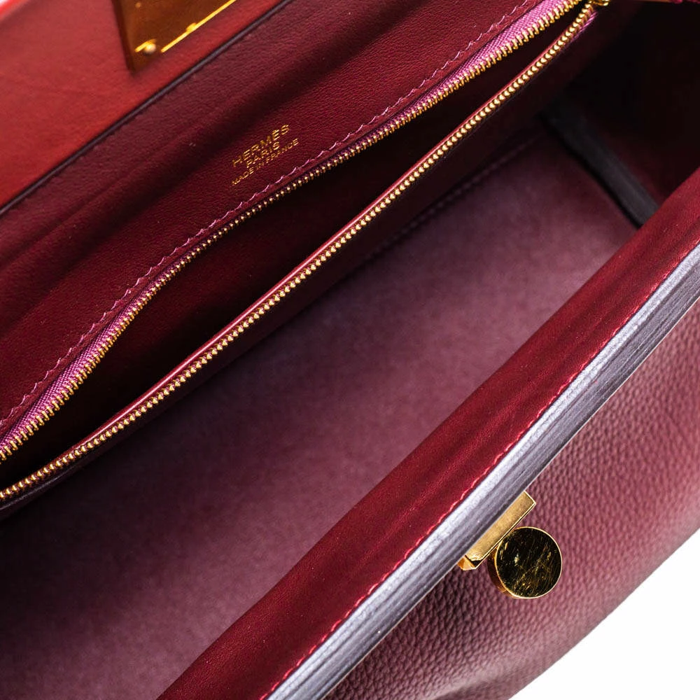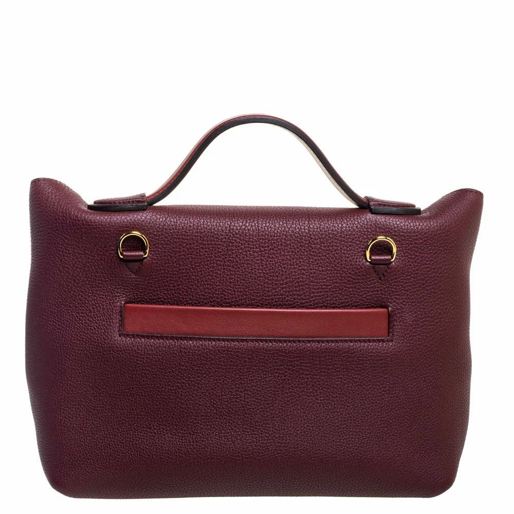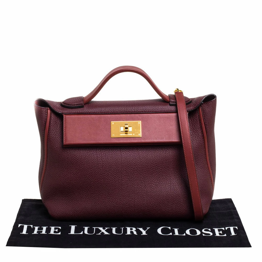 The 24/24 by Hermès appears similar to the iconic Kelly, but with a most relaxed, casual tone. Studying the details, the bag has a top handle and a shoulder strap, signature twist lock on the flap, a back pocket and a roomy interior. This version is crafted in Togo and Sombrero leather, and the hardware is in gold.