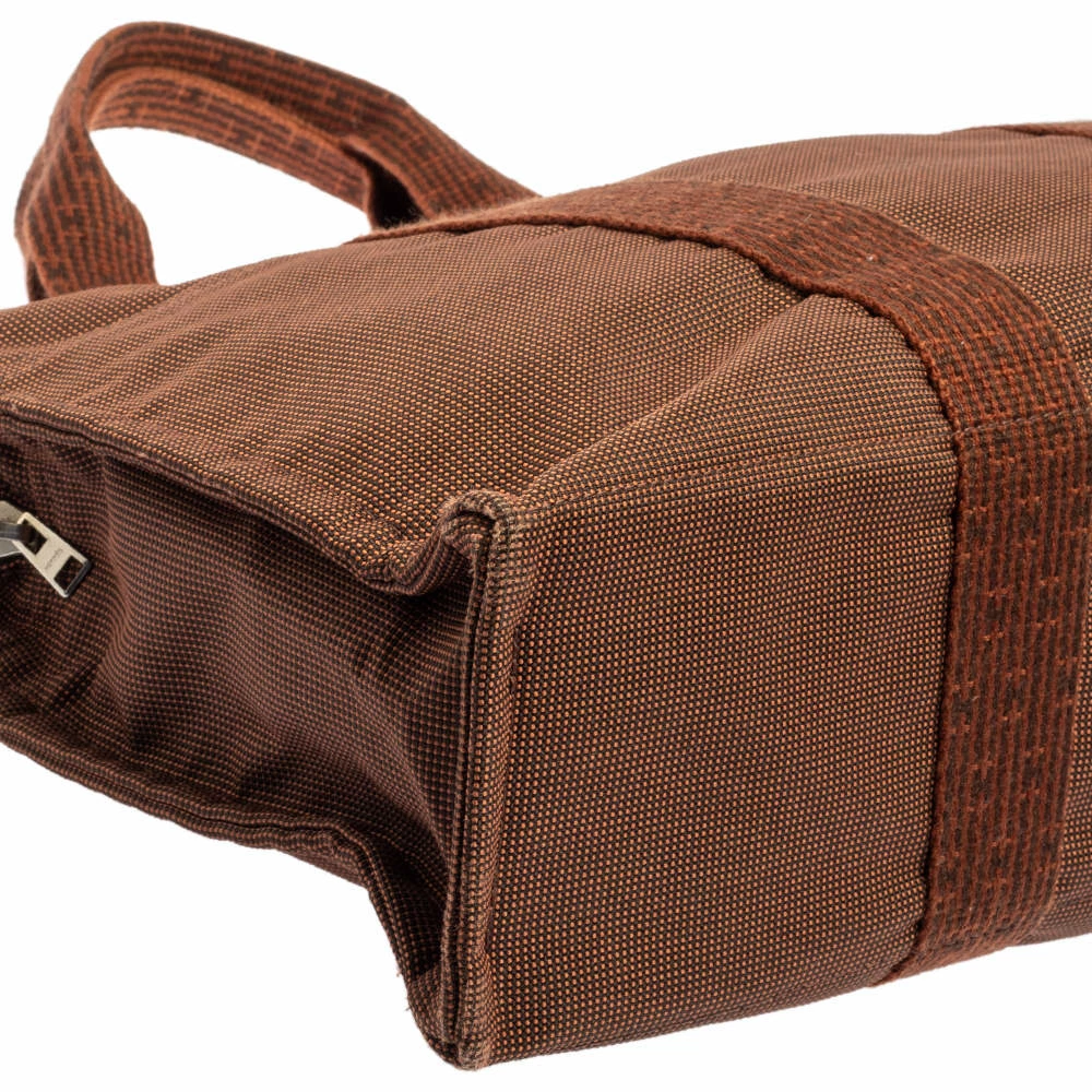 Hermes Herline tote can easily hold all your day-to-day essentials. It has been crafted from a canvas body and secured with snap button closure on the top. It comes with two flat top handles and a nylon-lined interior. Carry it for busier days.