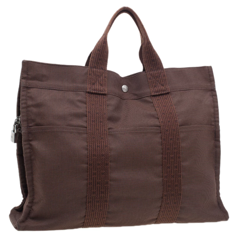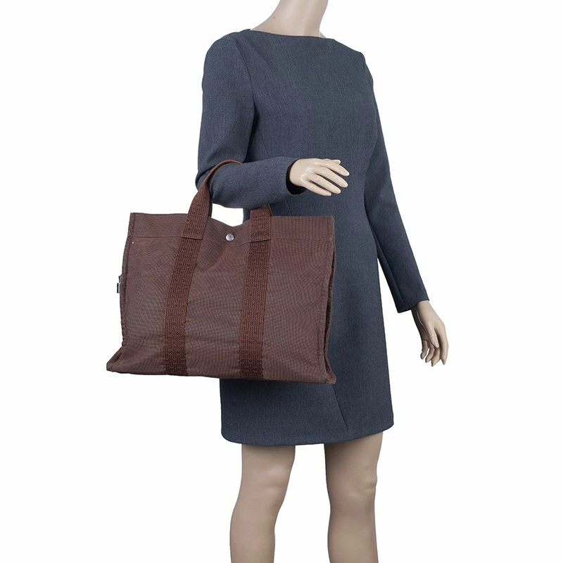 Casual and cool, this Hermes tote will keep your essentials handy on cool summer nights. Its brown tone canvas exterior is coupled with six pockets on the back and the front. It features an H canvas straps on the front and the back, coupled with matching double top handles. Lined with canvas, the interior has a zipped and a snap lock closure, and includes one patch pocket.
