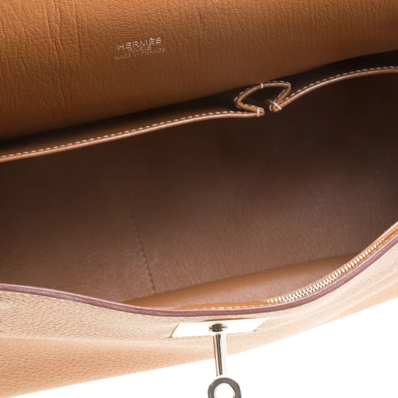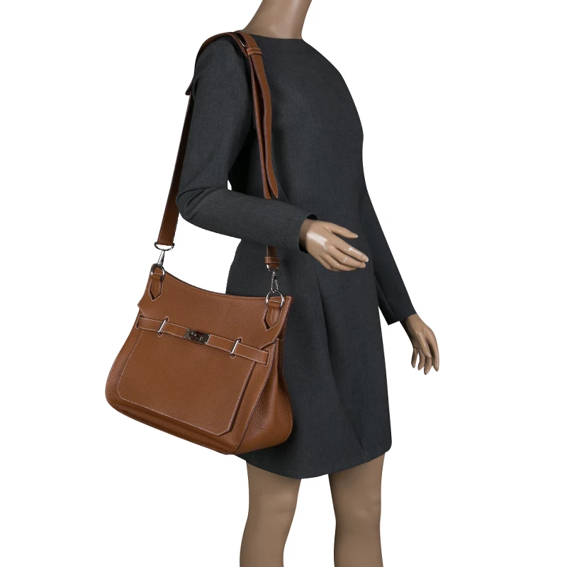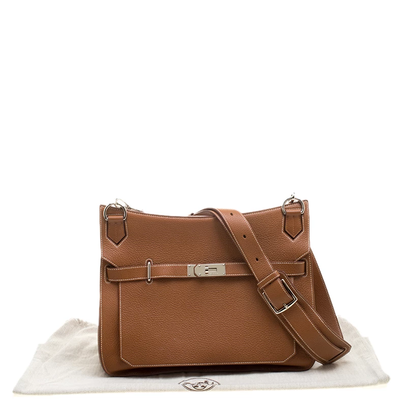 Hermes Jypsiere is a re-interpretation of the iconic Hermes Kelly. The messenger style bag is crafted from brown Clemence leather. The bag has a round bottom and features a thick adjustable shoulder strap that provides the needed comfort. The front flap has a turn lock closure and opens to a leather lined interior that houses two slip pockets and a zip pocket. This versatile bag can be worn over the shoulder or crossbody.