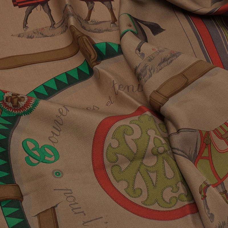 This vintage scarf from the fashion house of Hermès will become a staple in your wardrobe. Crafted in lightweight dip-dyed silk twill, and features a horse and buckle grid print with ‘Couvertures et Tenues’ and ‘Hermès Paris’ printed at center. With striped borders, it is finished with hand rolled edges.