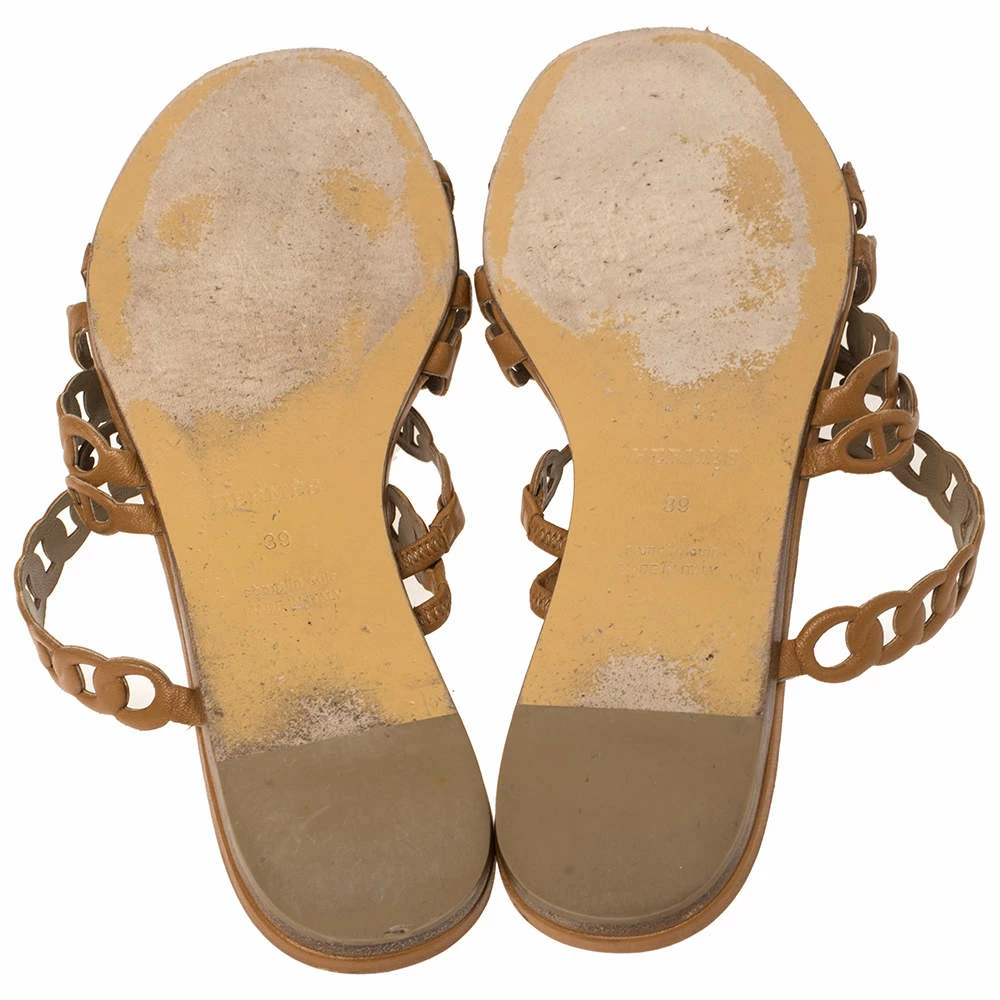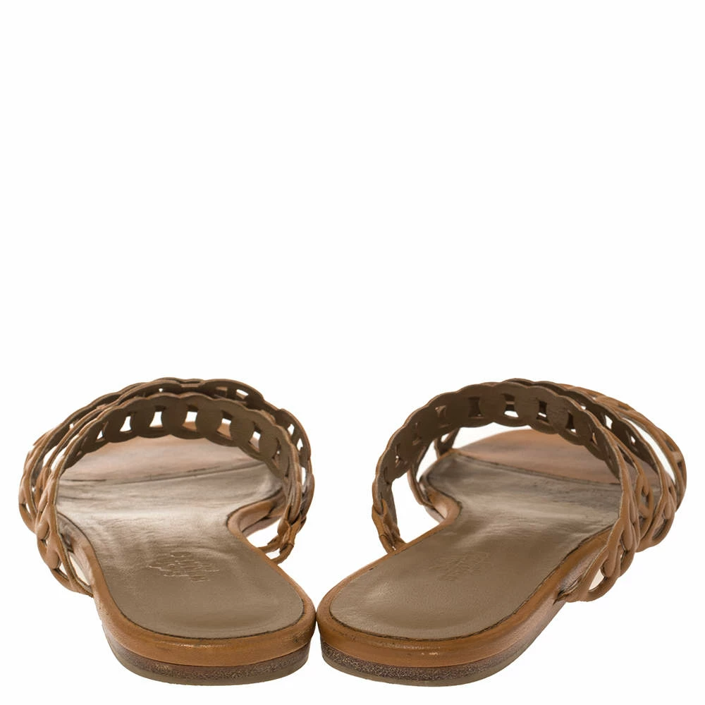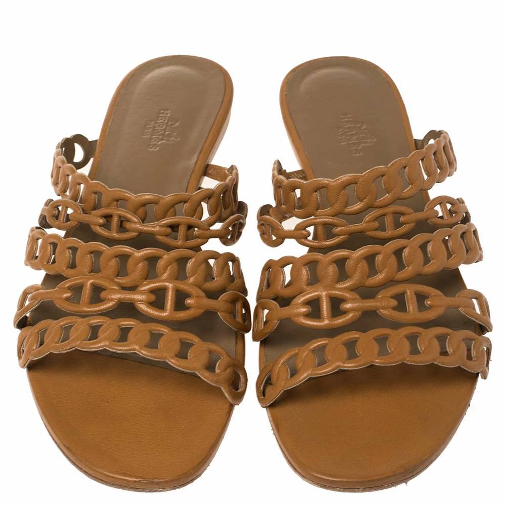 A must-have for the summers and for your vacations, these beautiful Hermes sandals are simple to pair with any day-time look and chic enough to add a subtle statement to complete the look. Constructed in brown leather, the strappy vamps are designed in a leather chain pattern.