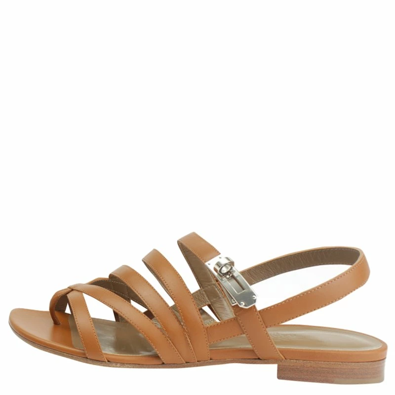 Cut from excellent quality brown leather, this pair of strappy flat sandals designed by Hermes is easy to flaunt footwear option. Originated in the fashion capital of Paris, Hermes is known as a leading powerhouse of leather accessories and other high-end products. The flat sandals feature multiple straps that form a toe loop, and an ankle loop secured with a buckle closure.