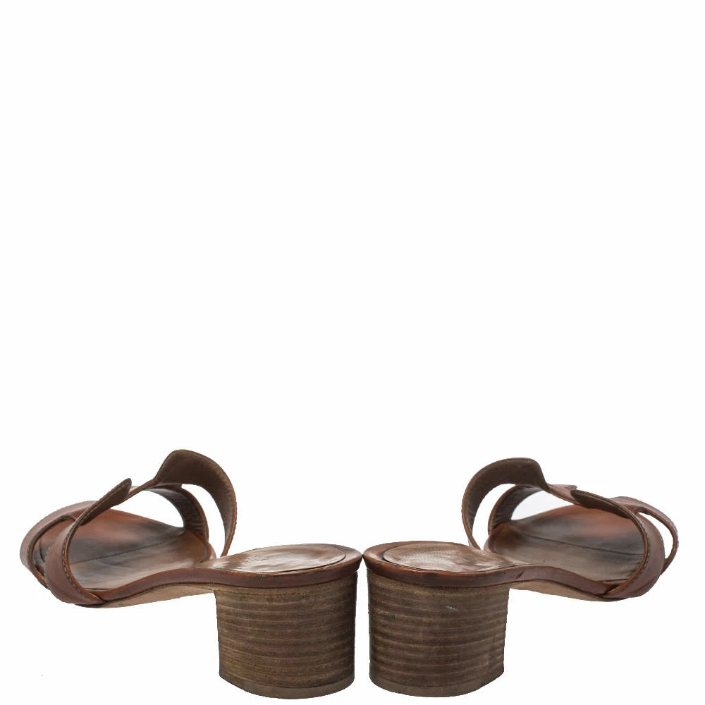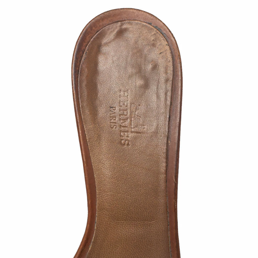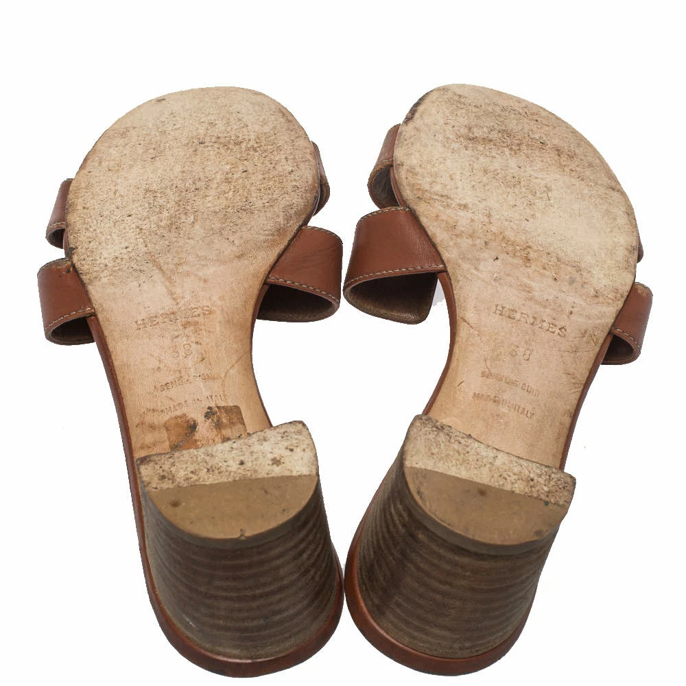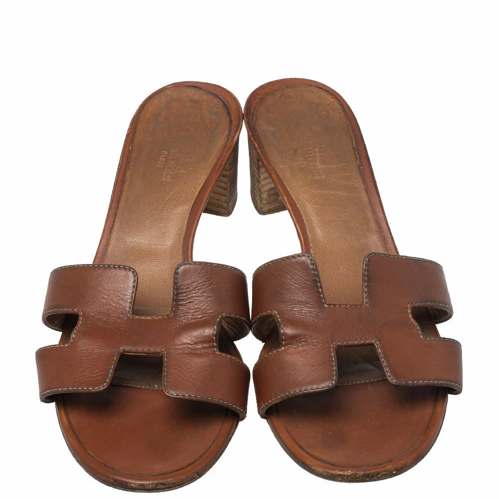 Crafted in brown leather, these Oasis slide sandals from Hermes are classy and comfortable with their 4.5 cm block heels. These slides feature the signature H-shaped straps on the front. The insoles are lined with leather and carry the brand label.
