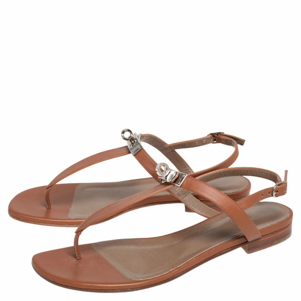 Amp up your style quotient as you glam up your casual outfit with these gorgeous Hermes sandals. These leather sandals are designed in a thong silhouette enhanced with the signature Kelly lock. They are styled with buckled ankle fastenings, labeled insoles, and durable leather soles.
