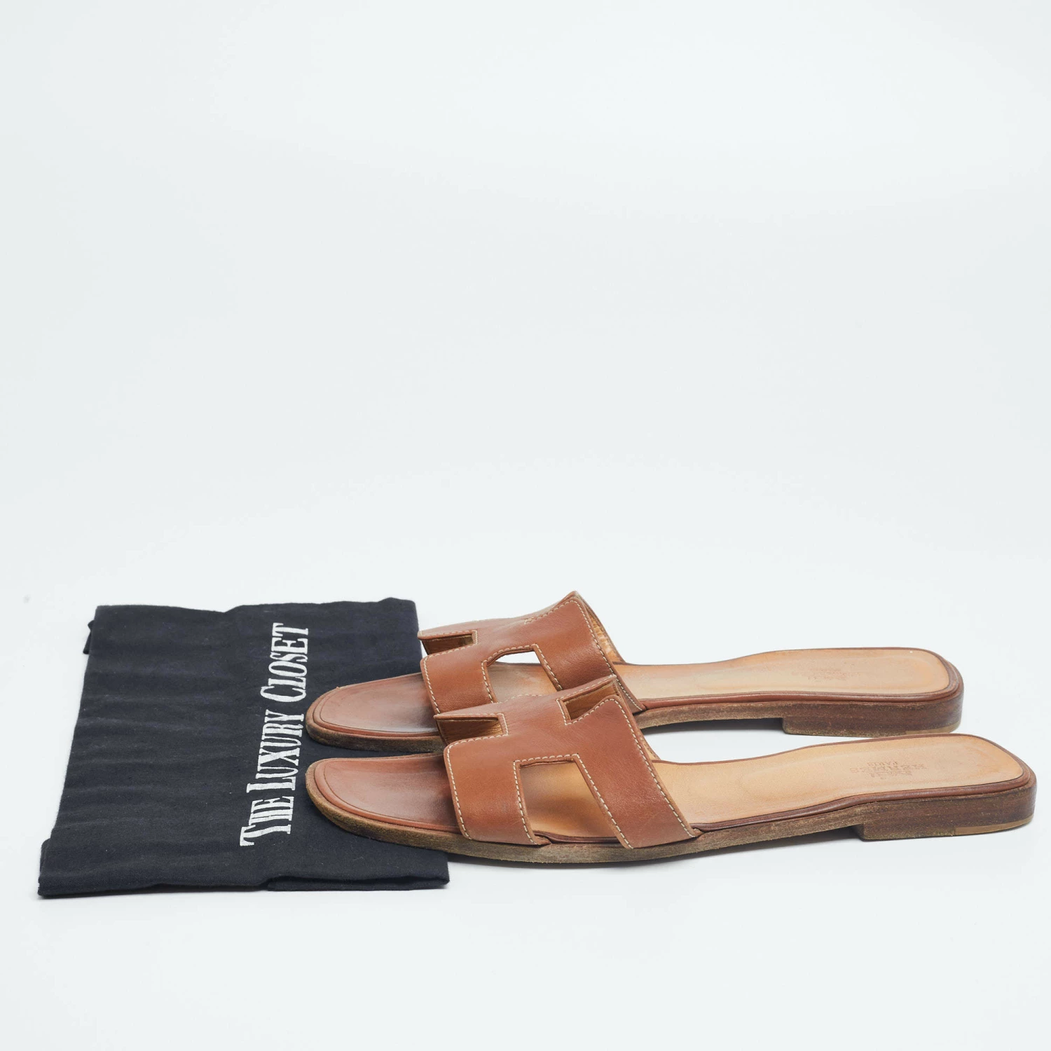 Put your best foot forward this season in these pretty Hermes flats. These brown Oran sandals have been crafted from leather in Italy and they feature the iconic H on the vamps as well as insoles meant to provide comfort at every step. These sandals are sure to attract admirers!