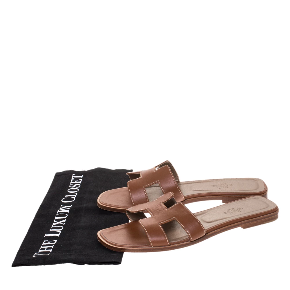 Put your best foot forward this season in these pretty Hermes sandals. These brown Oran sandals have been crafted from leather in Italy and they feature the iconic H on the vamps as well as insoles meant to provide comfort at every step. These sandals are sure to attract admirers!