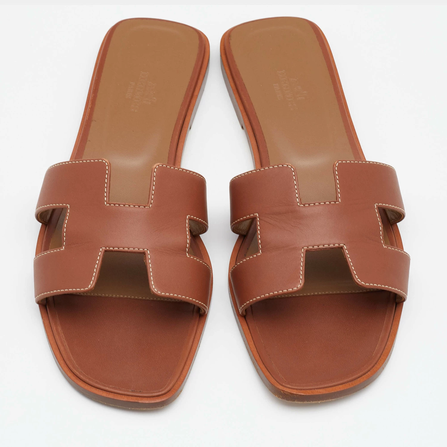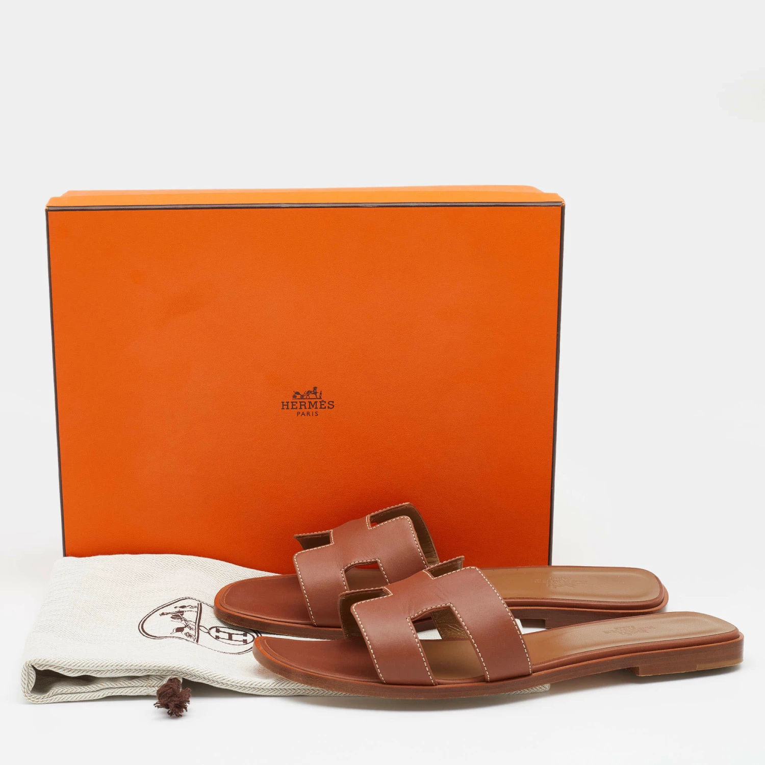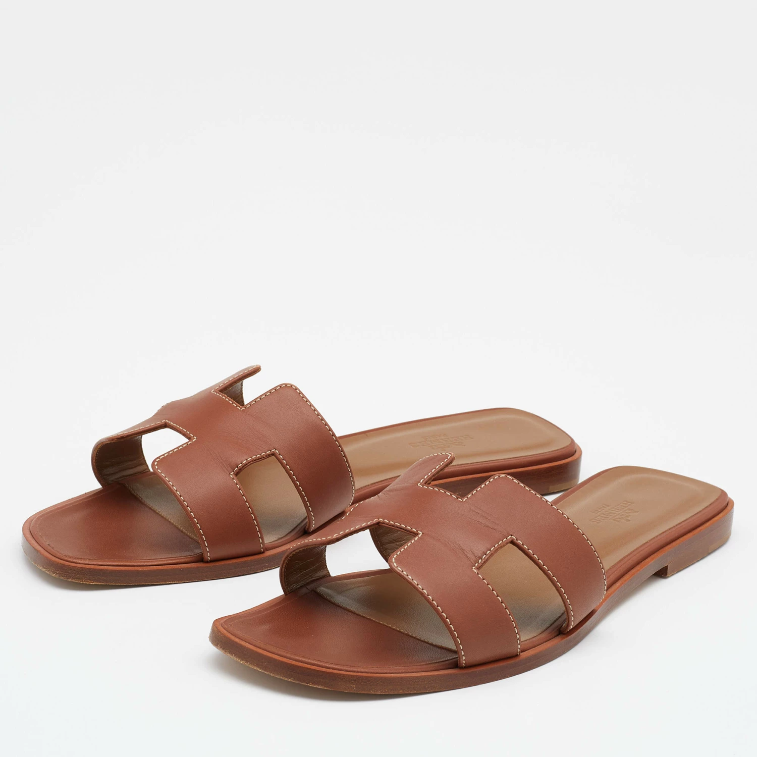 Add the iconic Hermès Oran sandals to your shoe collection with this pair. These brown-hued flats have been crafted in Italy, and they feature the iconic H on the vamps and lined insoles in leather to provide comfort at every step.