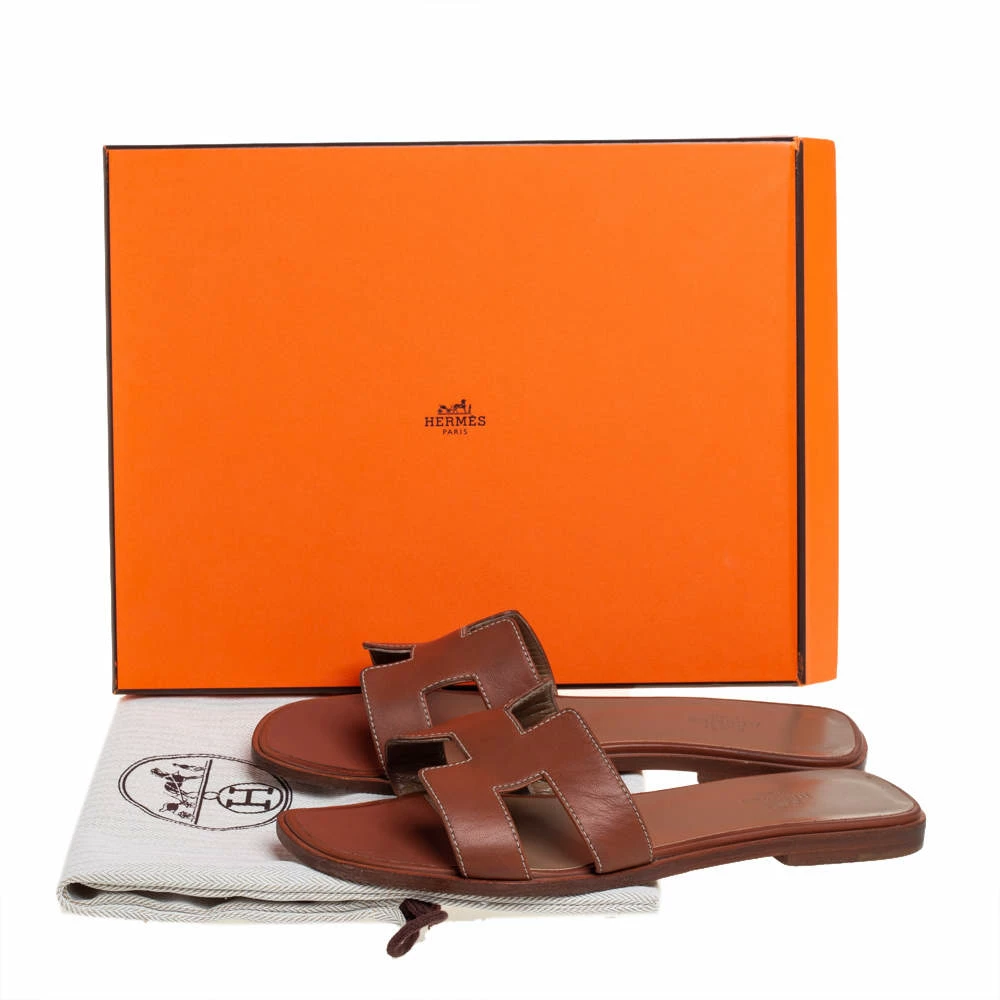 Put your best foot forward this season in these pretty Hermes sandals. These brown Oran sandals have been crafted from leather in Italy and they feature the iconic H on the vamps as well as insoles meant to provide comfort at every step. These sandals are sure to attract admirers!