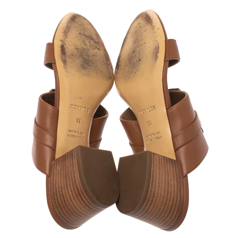 These brown leather sandals by Hermes are defined by overlapping straps across the vamps and silver-tone twist locks. They feature open toes, leather insoles and 5.5 cm block heels. The Ovation sandals are easy to slip on and off.