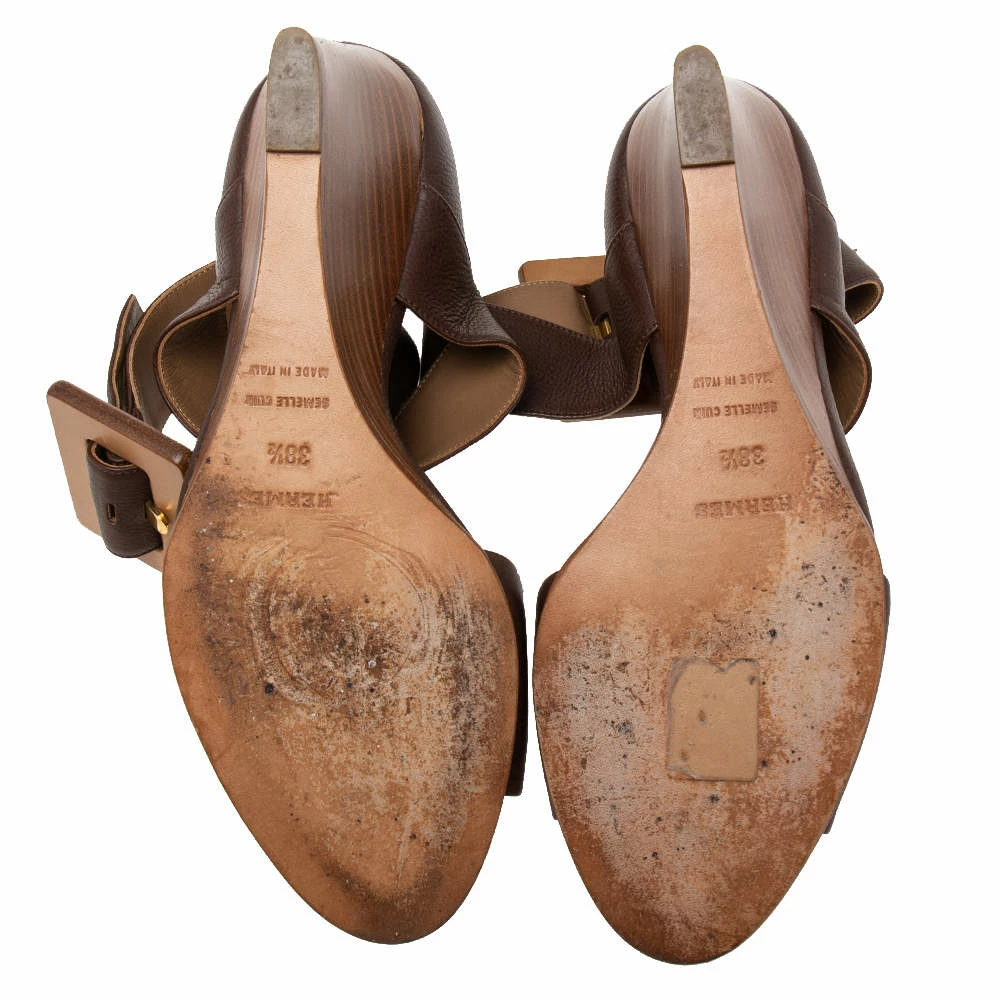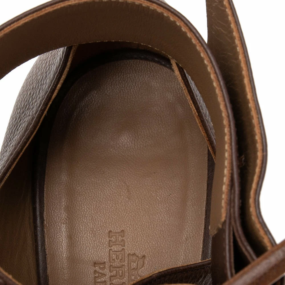 An alluring Hermès creation, the wedge heels of these sandals will give you the perfect balance and posture. Constructed from leather, they feature a distinct gold-tone ankle buckle closure, open toes, and a single wide strap on the vamps. The leather insole and sole promise durability and comfort.