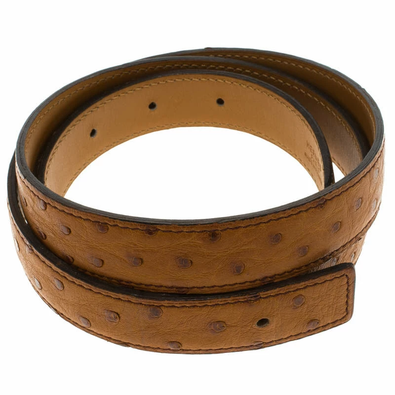 A classic add-on to your collection of belts, this Hermes Brown Ostrich Belt Strap has been crafted from exotic leather in France. It has a trendy brown-colored exterior that will complement any buckle shape you choose. This sleek piece carries an edgy style, making it a wardrobe essential.